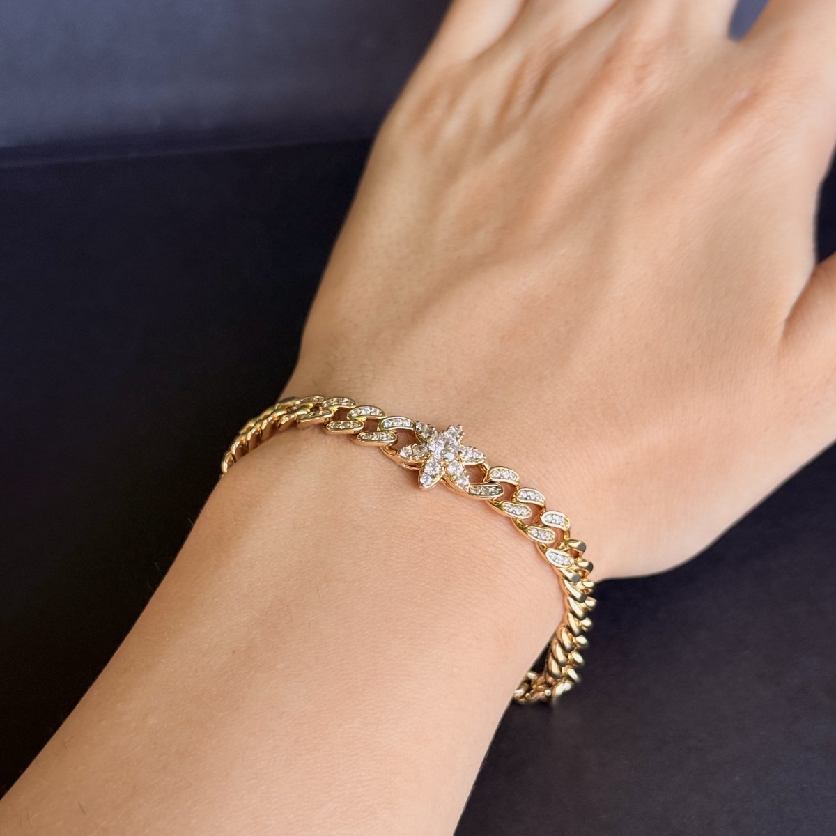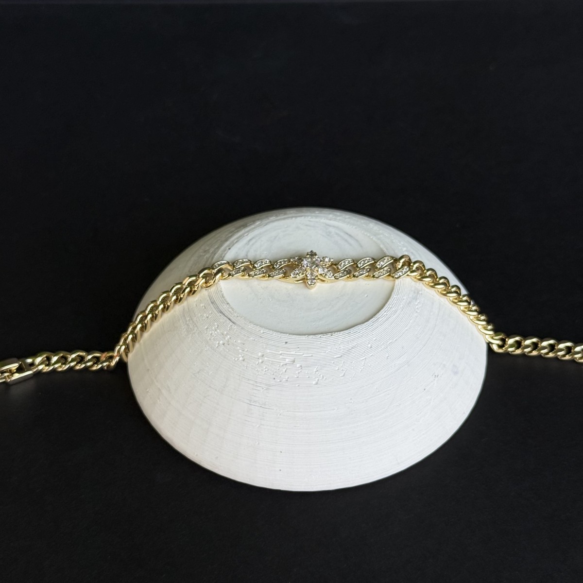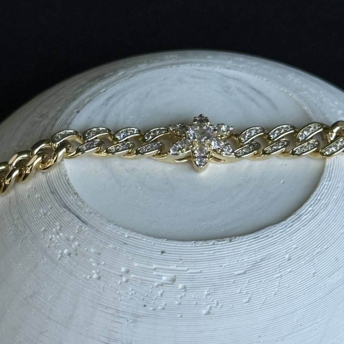 Altın zincir üzerine yerleştirilen taşlı çiçek deseni, bileziğe zarif bir şıklık kazandırıyor. Hem gündelik hem de özel davetlerde kullanılabilecek bir model.