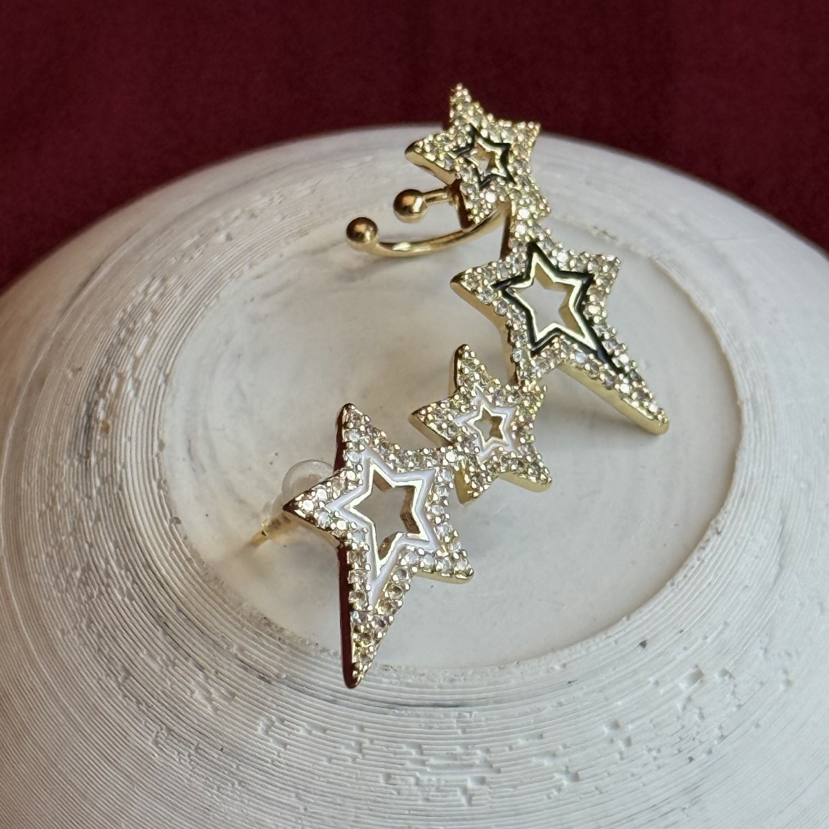 Kıkırdak kısmına da uyum sağlayacak şekilde tasarlanmış bu çoklu yıldızlı küpe, kulağınızı zarif bir şekilde sarar. Piercing deliklerine ihtiyaç duymadan, modern ve şık bir görünüm elde etmenizi sağlar. Hem gündüz hem gece kullanım için mükemmel bir seçenek.