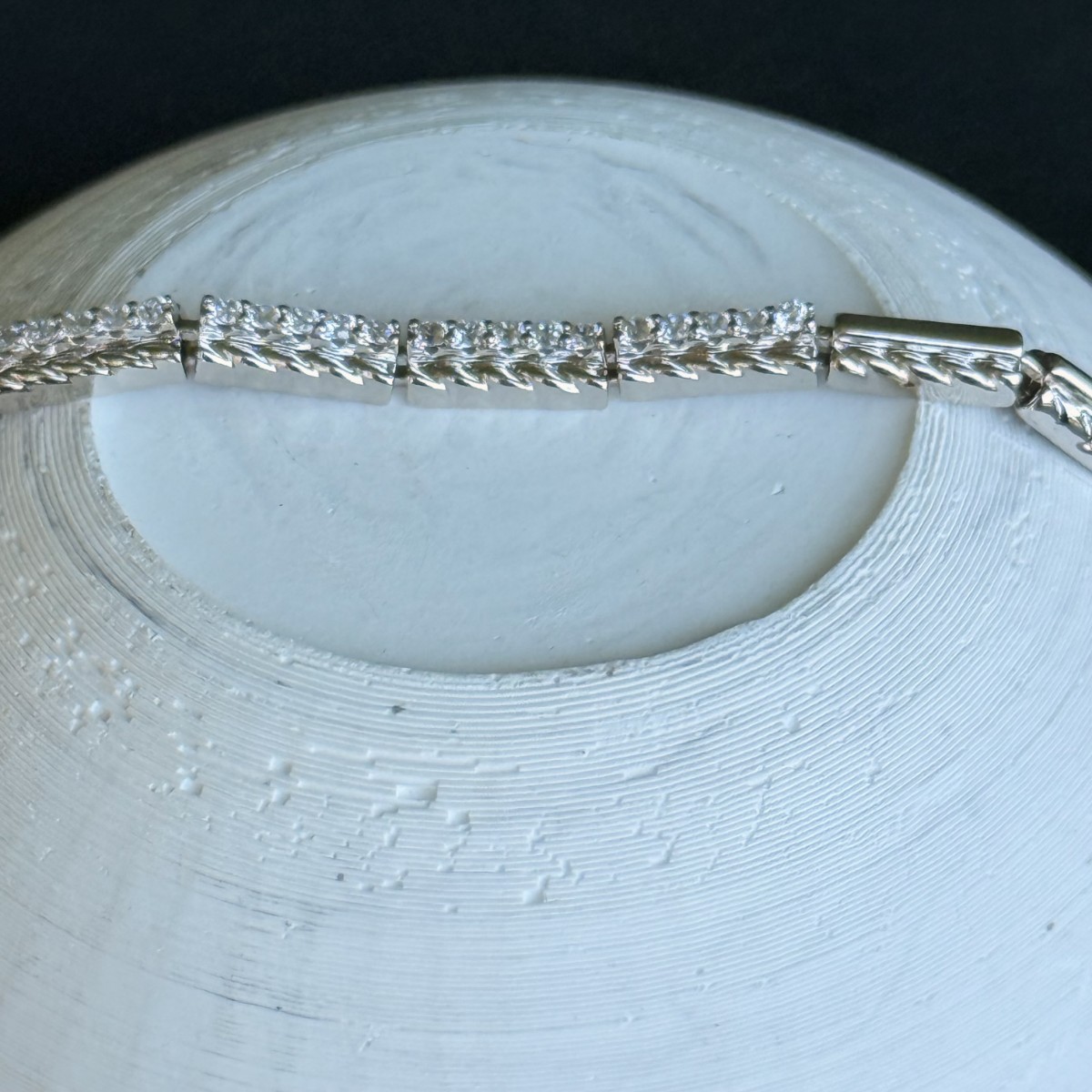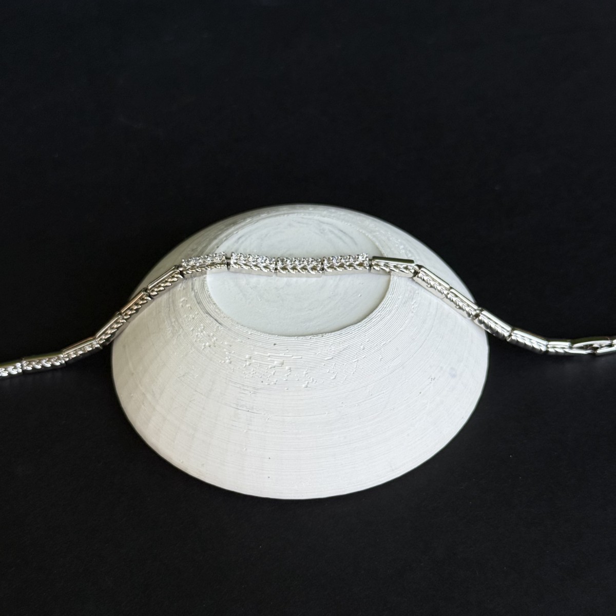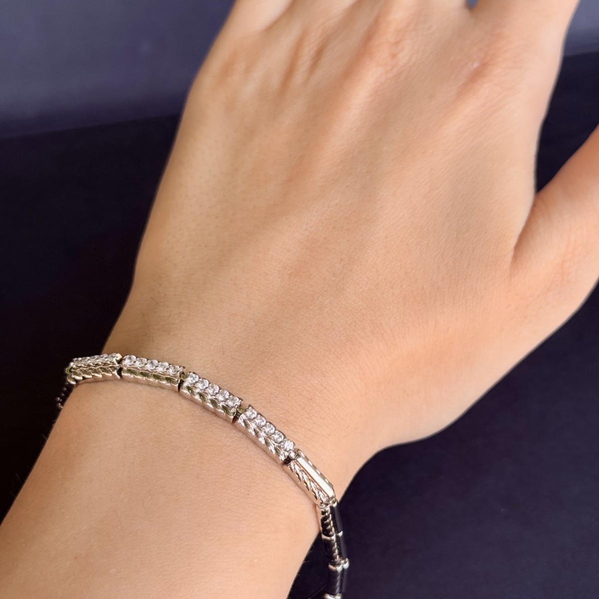 Örgü desenli dikdörtgen formlar, parlak taşlarla birleştirilerek modern bir görünüm kazandırılmıştır. Maskülen bir dokunuş taşıyan bu bilezik, zarif taşların etkisiyle feminen şıklıkla dengelenmiştir.