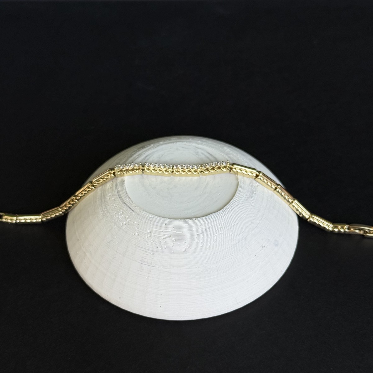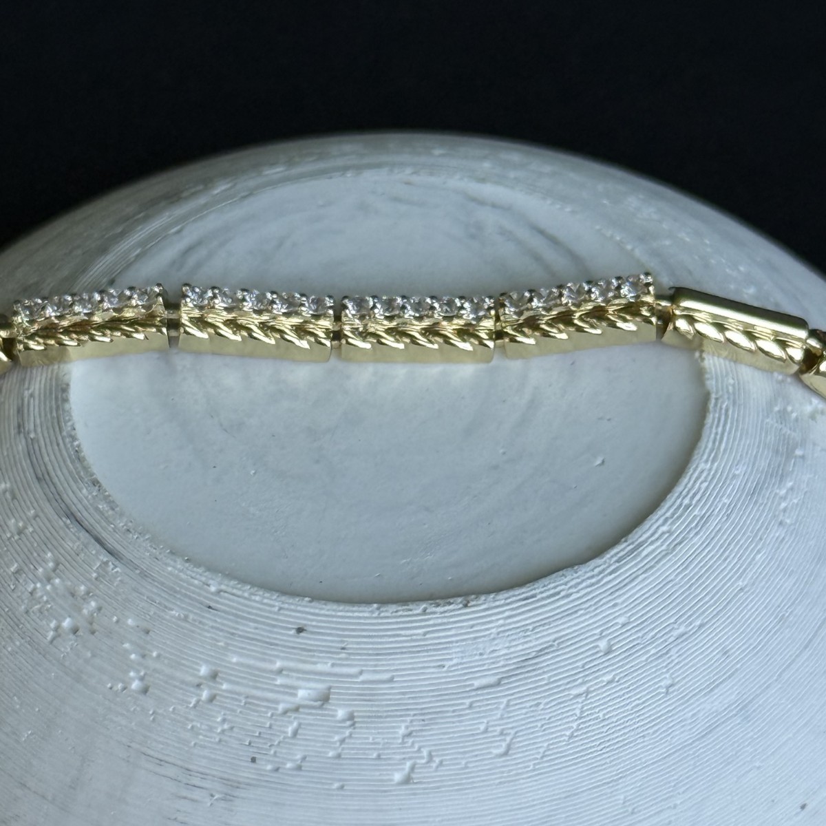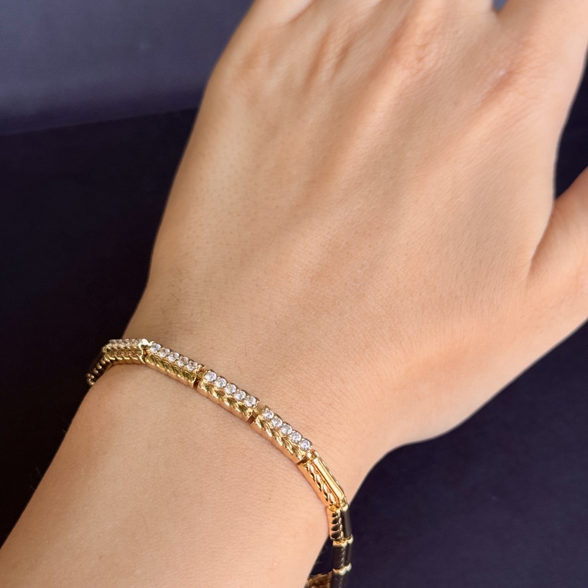 Örgü desenli dikdörtgen formlar, parlak taşlarla birleştirilerek modern bir görünüm kazandırılmıştır. Maskülen bir dokunuş taşıyan bu bilezik, zarif taşların etkisiyle feminen şıklıkla dengelenmiştir.