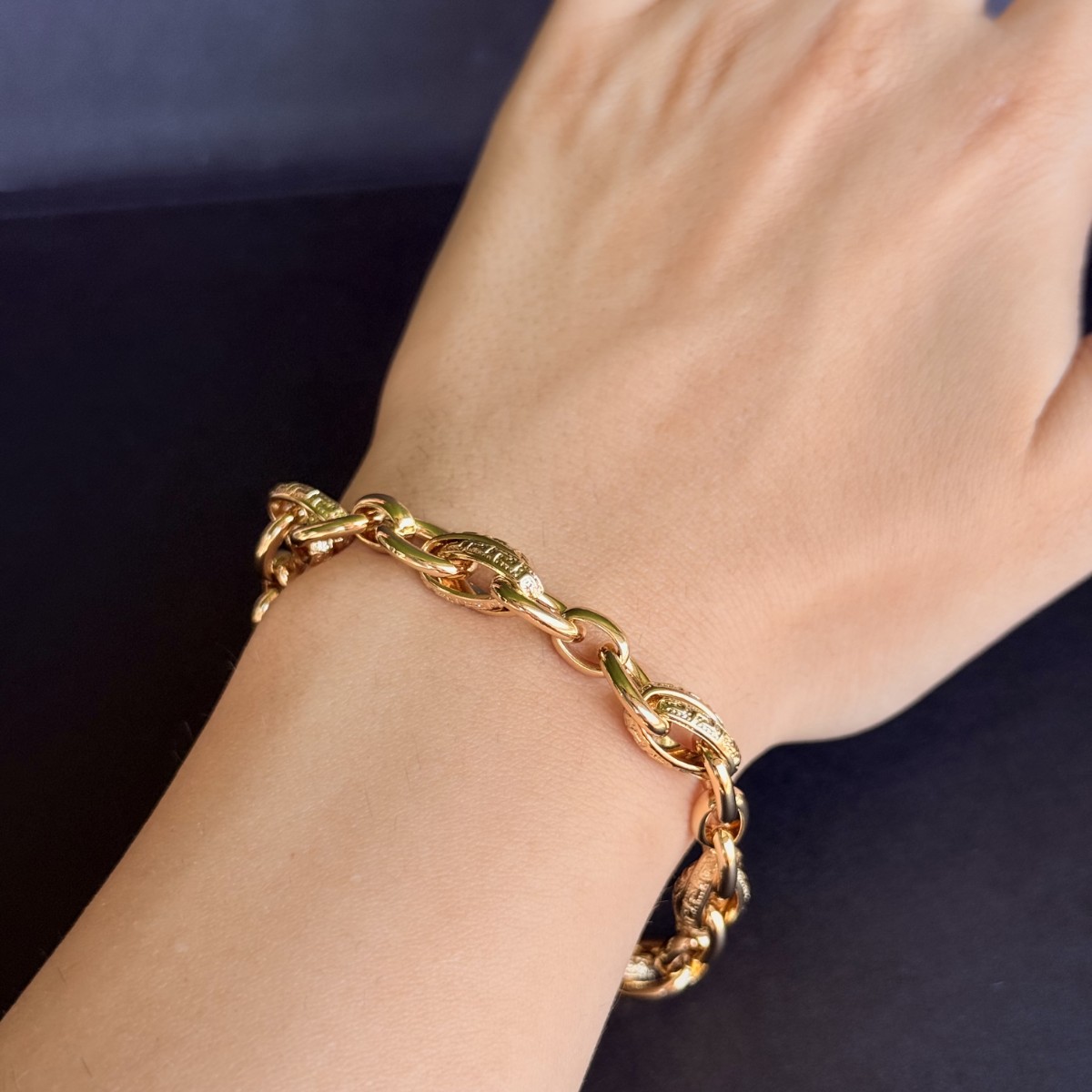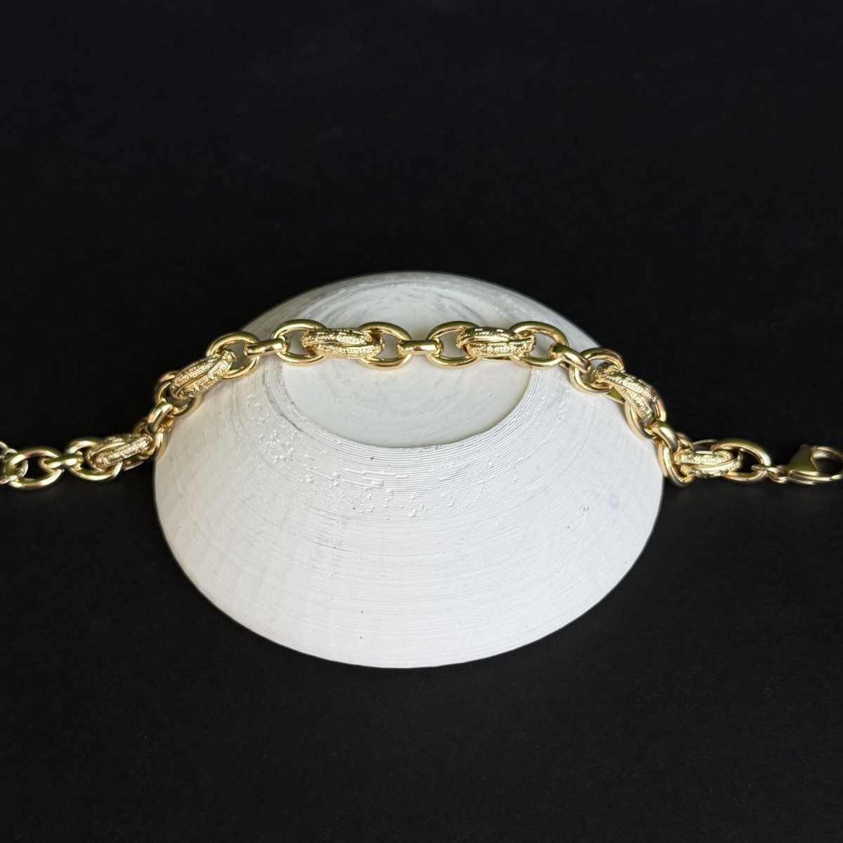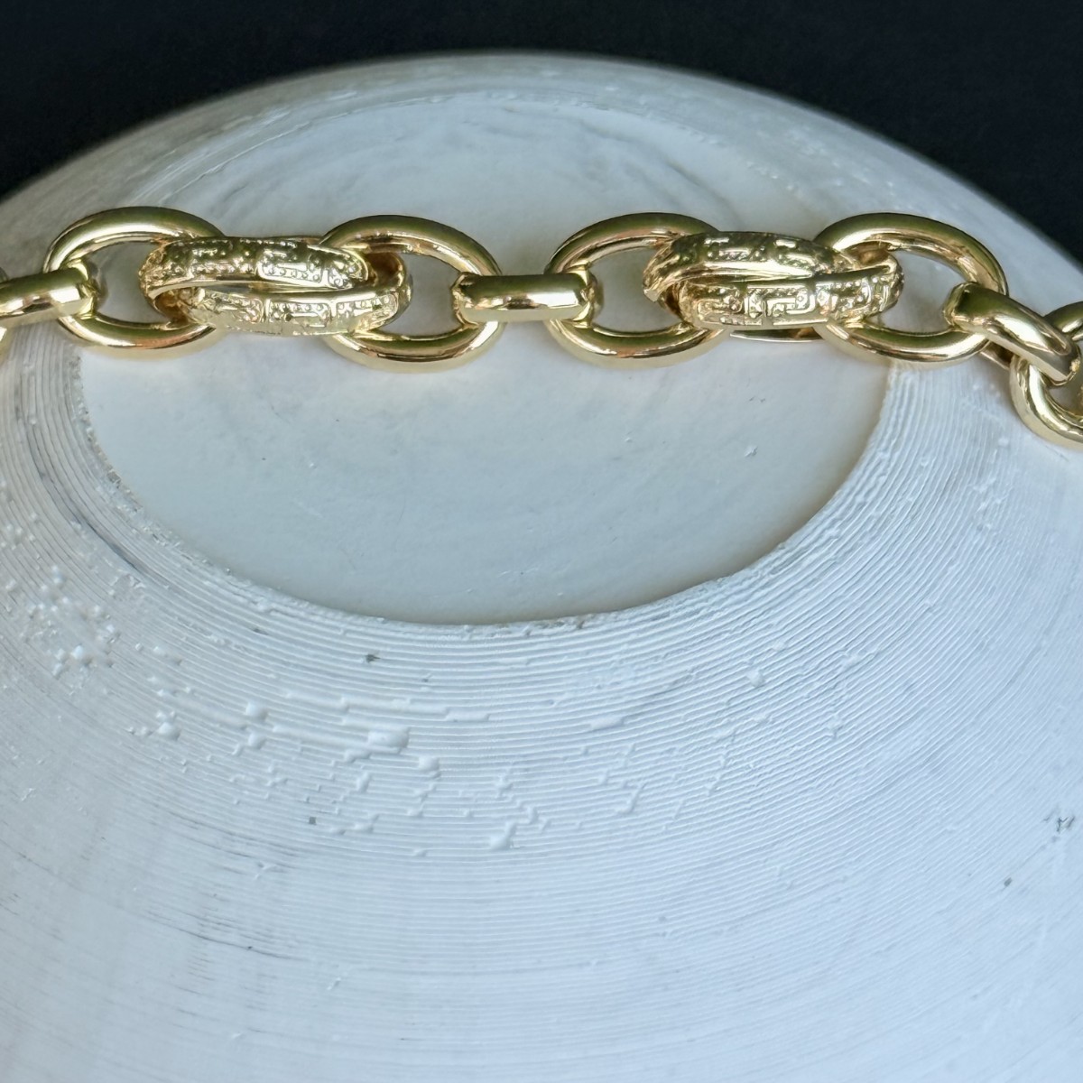 Oval halkalar arasında taşlı detaylı ara parçalar kullanılmış. Hem sade hem gösterişli bir hava katıyor.