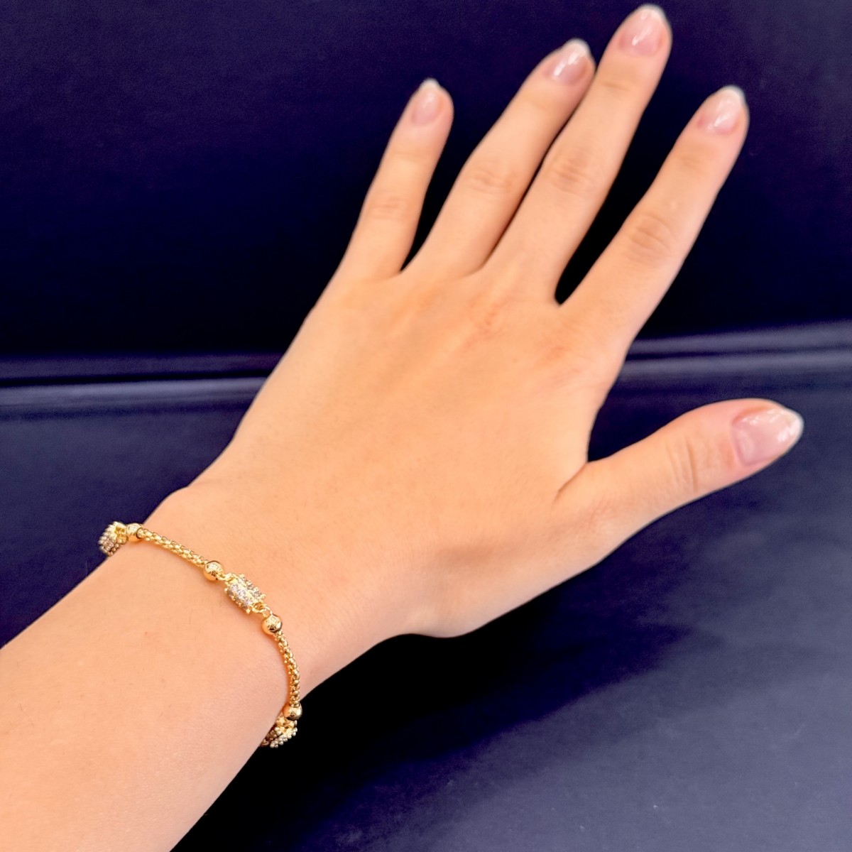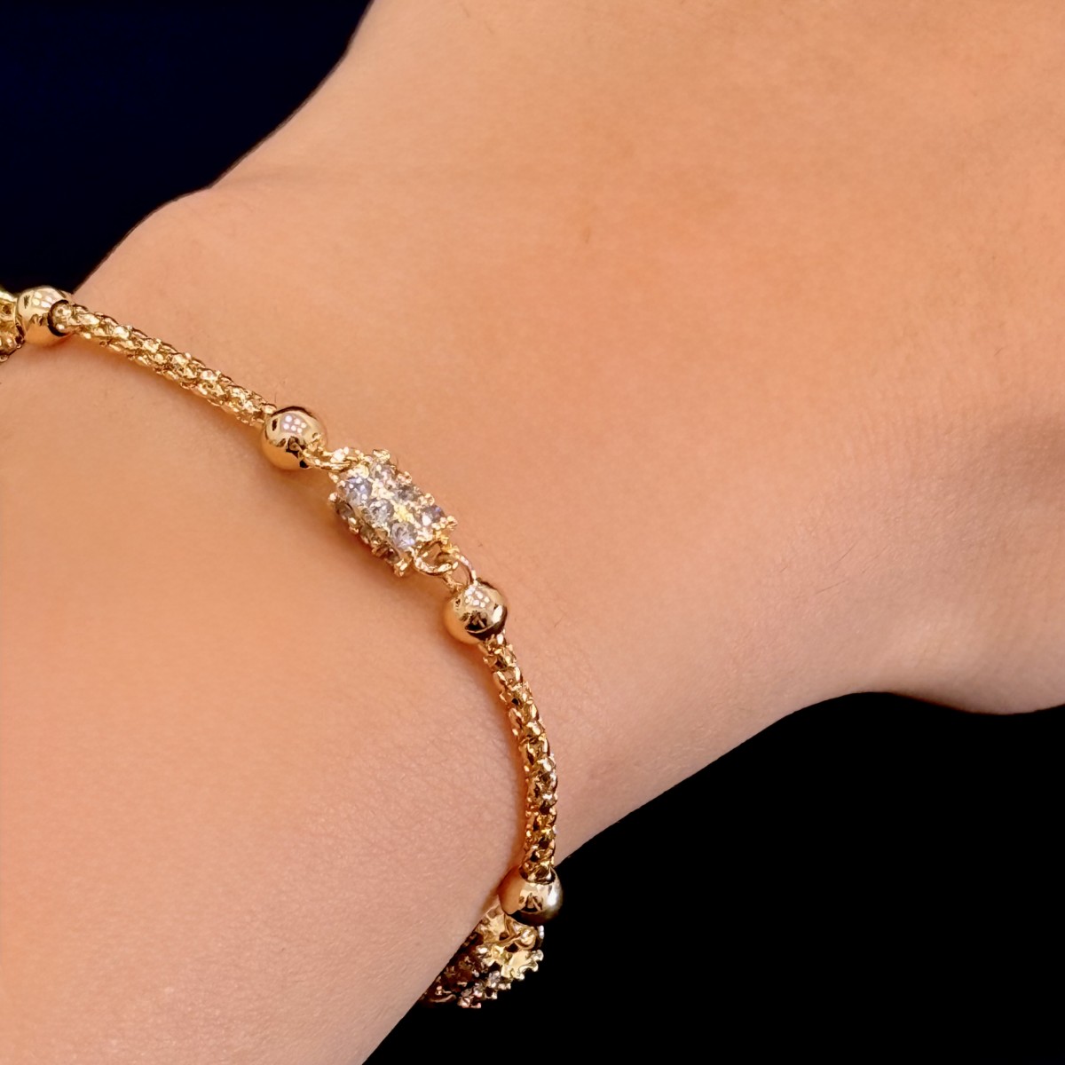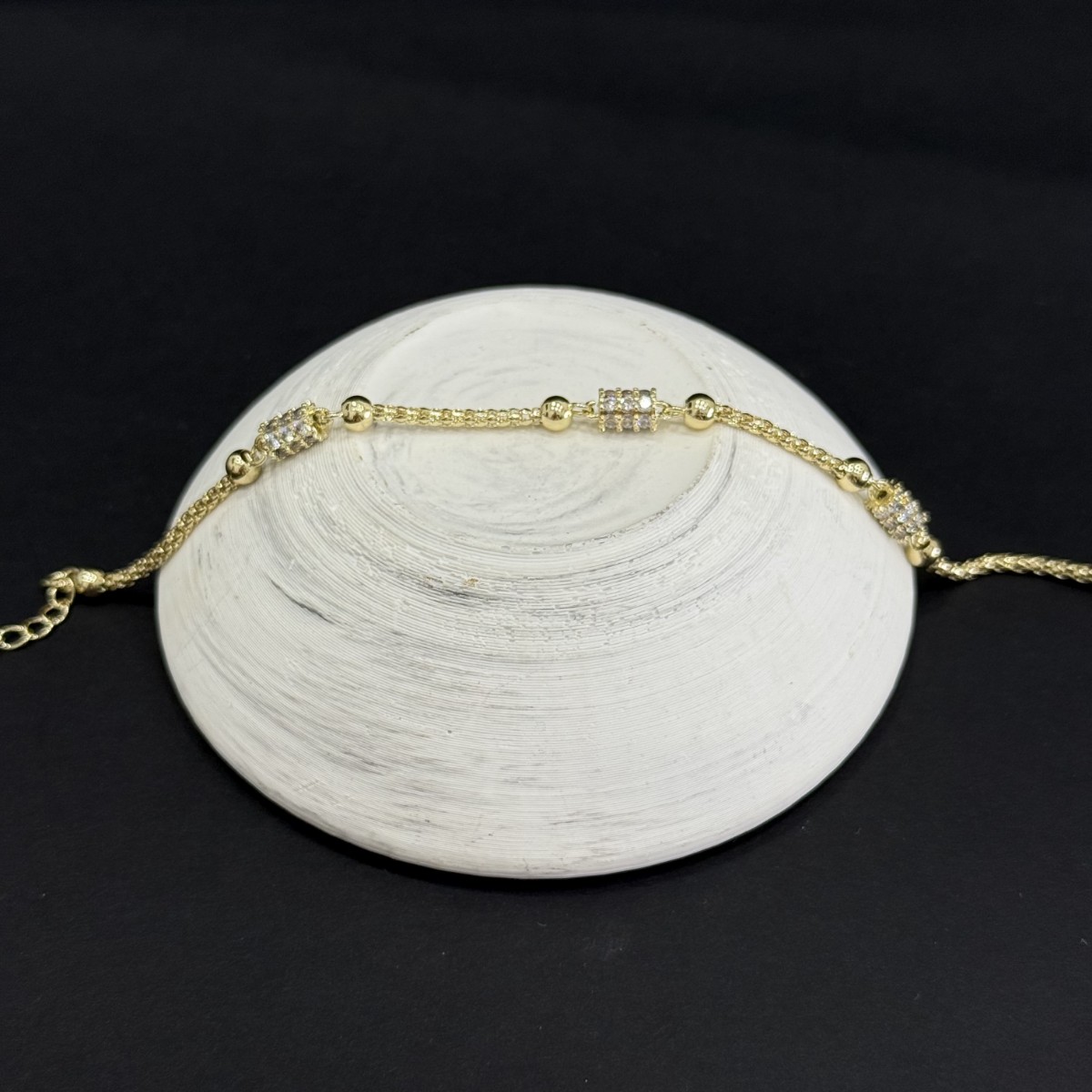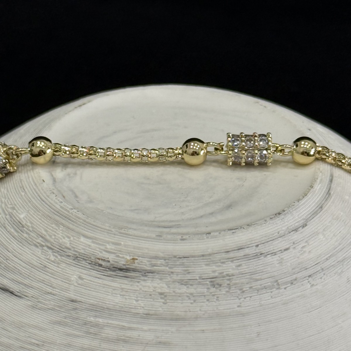 İnce, dokulu zincirin üzerine yerleştirilmiş silindirik pavé zirkon parçalar, bilekte temiz ve zarif bir vurgu yaratır. Tek başına yeterince şık, katmanlı kullanımda ise kombinleri tamamlayan bir temel parça.