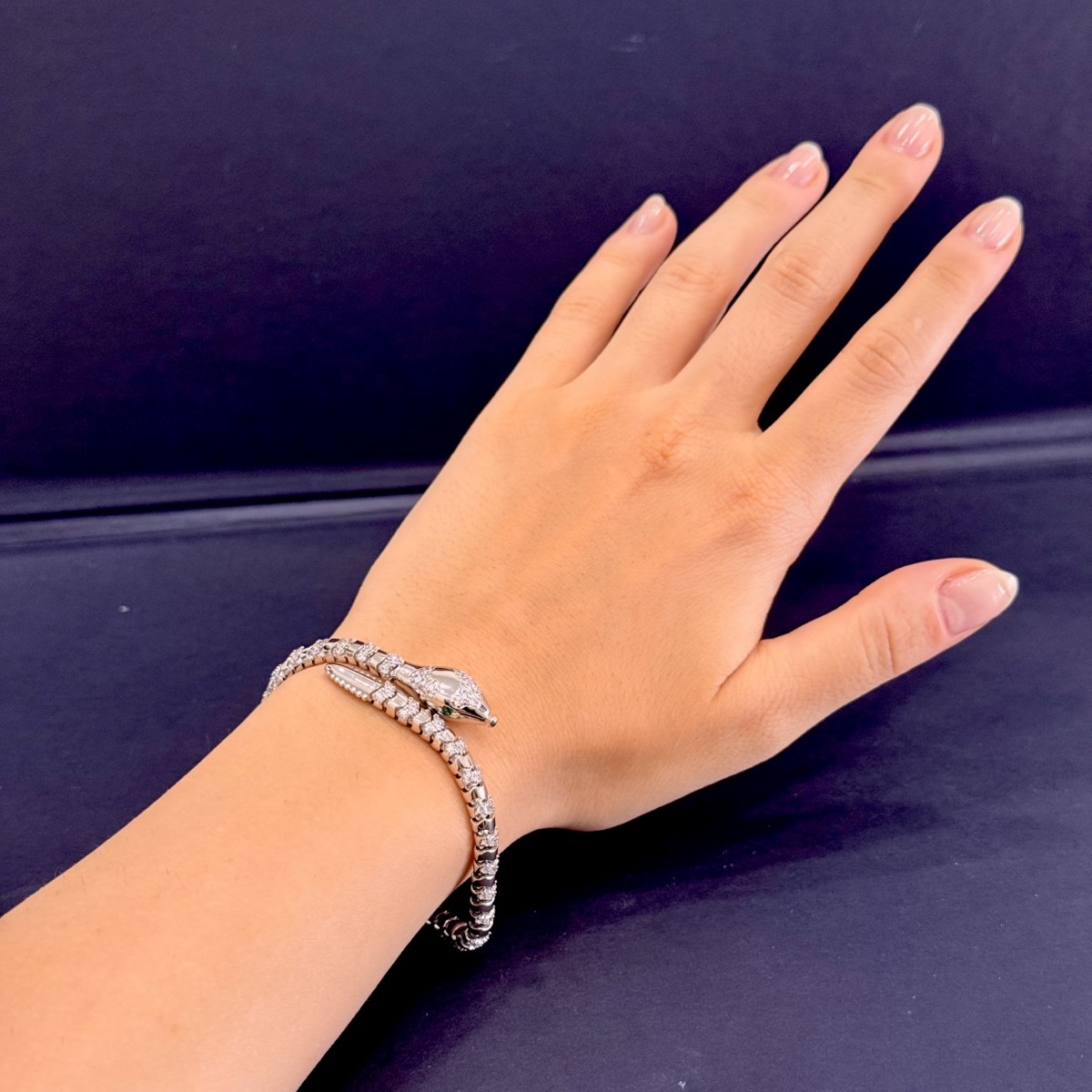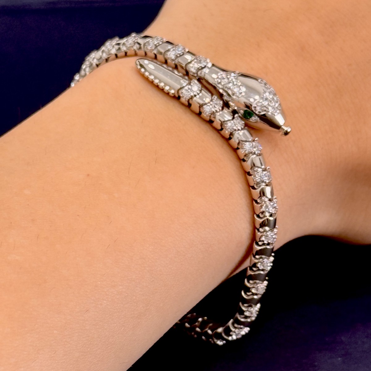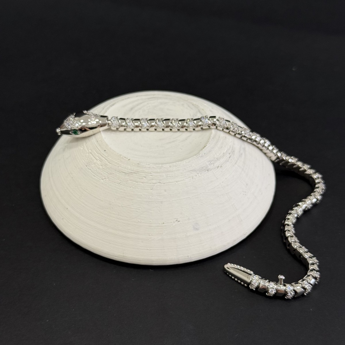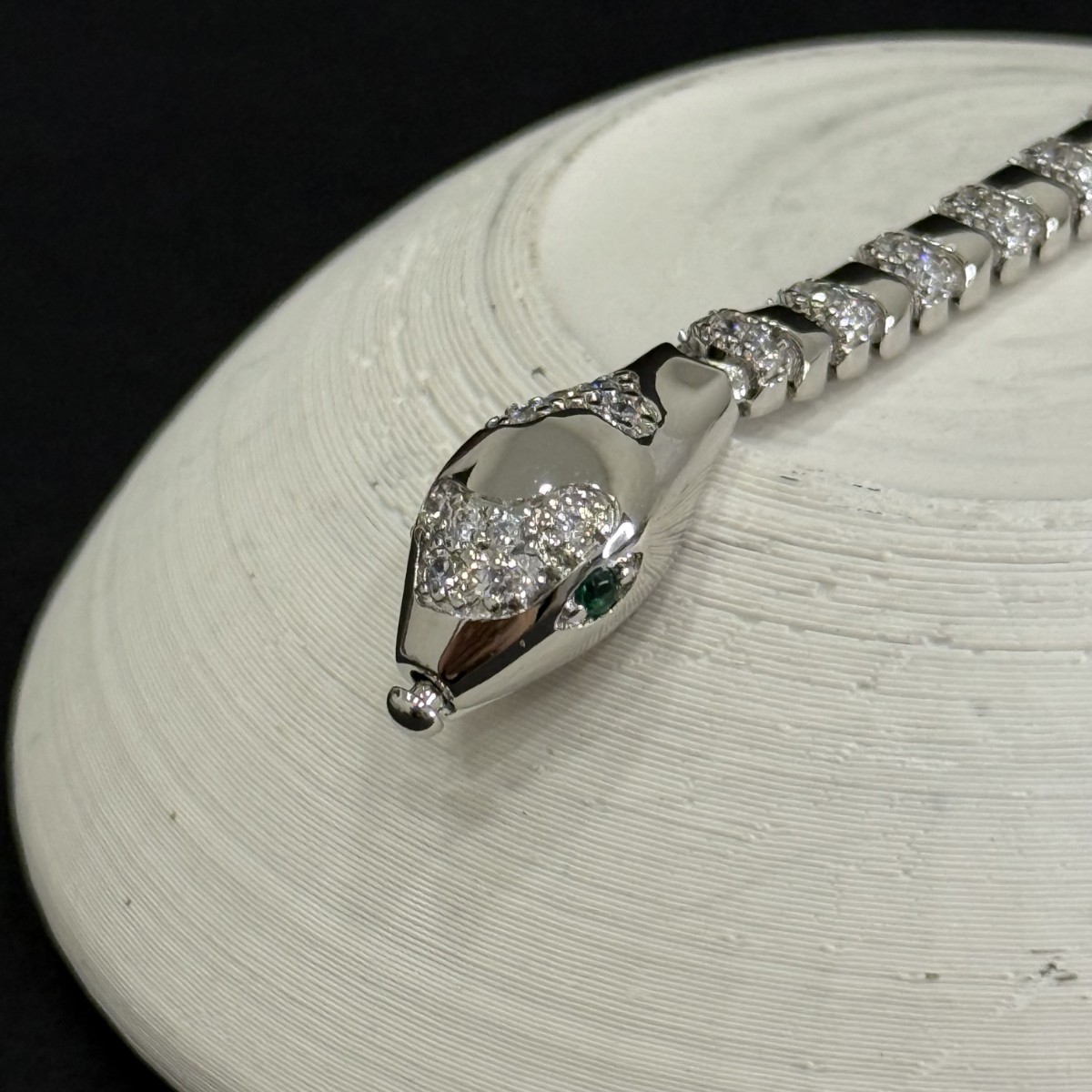 - Baş: Üstte kısmi pavé taş kaplama; yanda zümrüt-tonu yeşil göz.