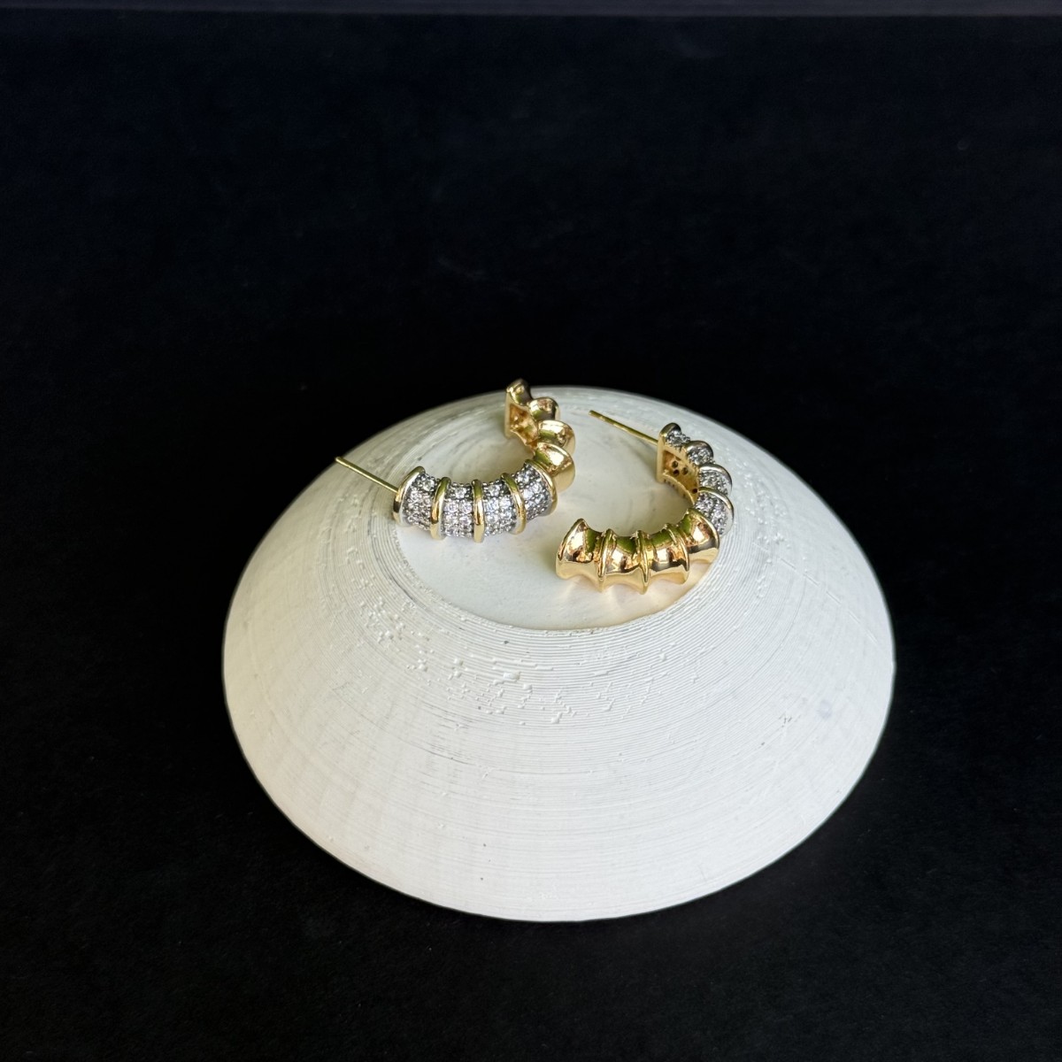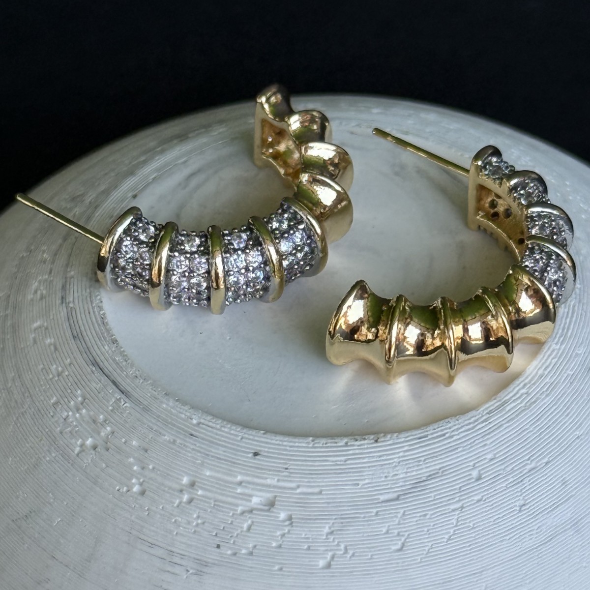 Altın tonlar üzerine şerit şeklinde yerleştirilmiş parlak taşlarla süslü bu küpe, gösterişli ama aynı zamanda zarif bir hava yaratıyor.