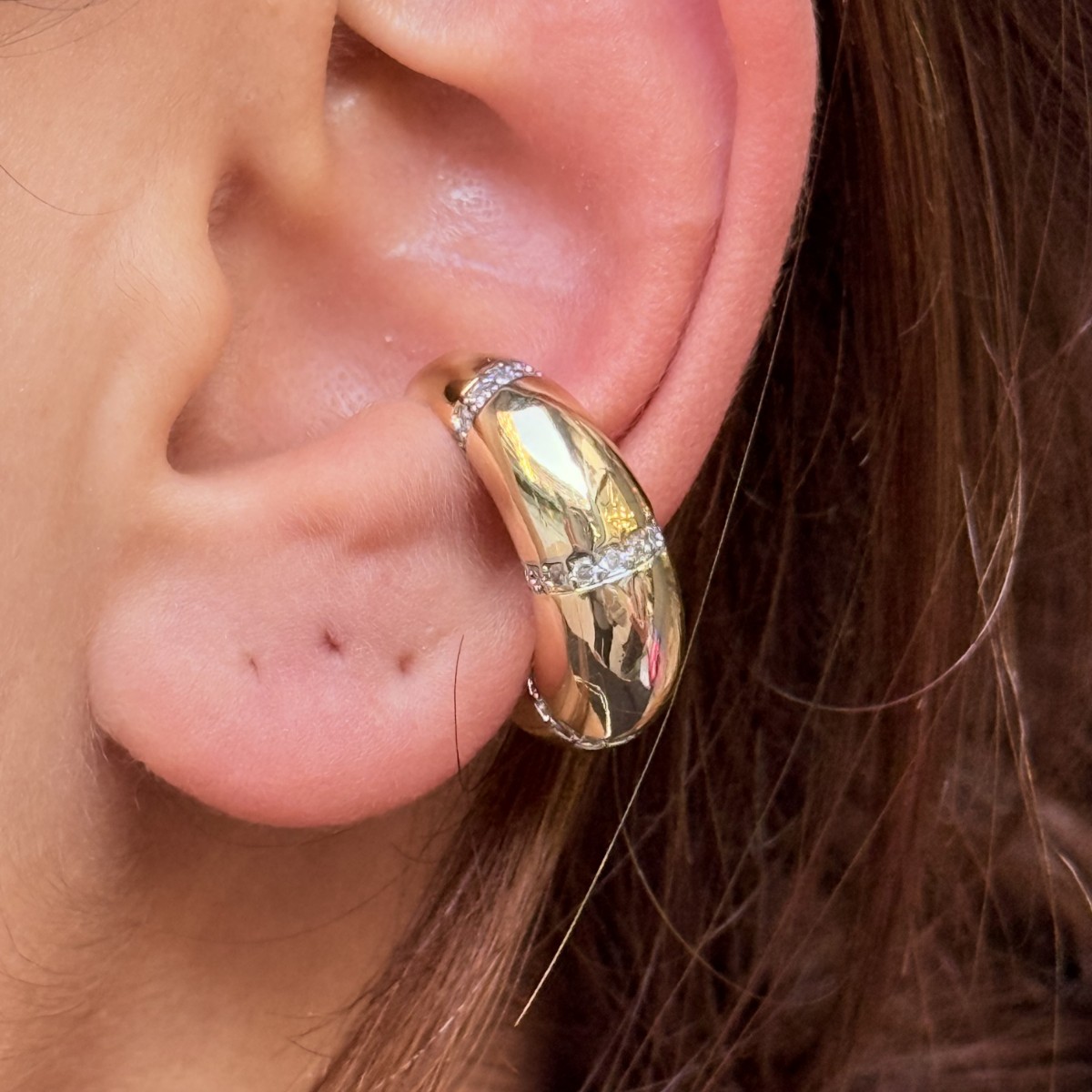 Kıvrımlı altın formuyla tasarlanan bu kıkırdak, taşlı detaylarla birleşerek kulakta zarif bir akış etkisi yaratıyor. Klasik ve modernin buluştuğu nadir parçalar arasında.