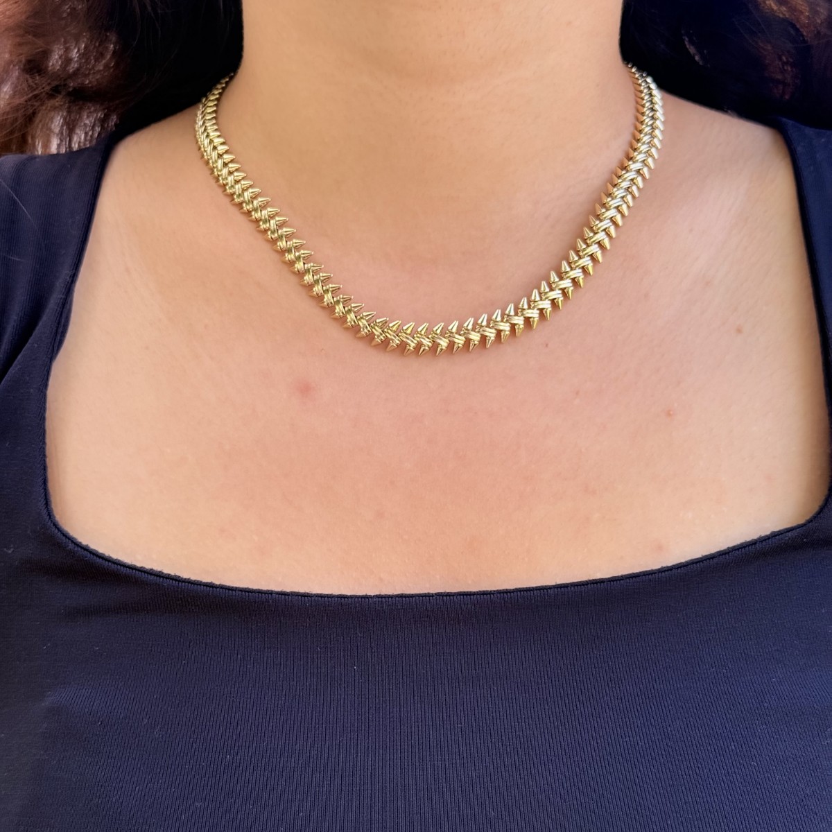 Modern ve cesur tasarımıyla öne çıkan üçgen form detayları, boynunuzda ışığı farklı açılardan yansıtarak güçlü bir şıklık sunar. Özel davetlerde ve günlük kombinlerde tek başına dahi dikkat çeker.
