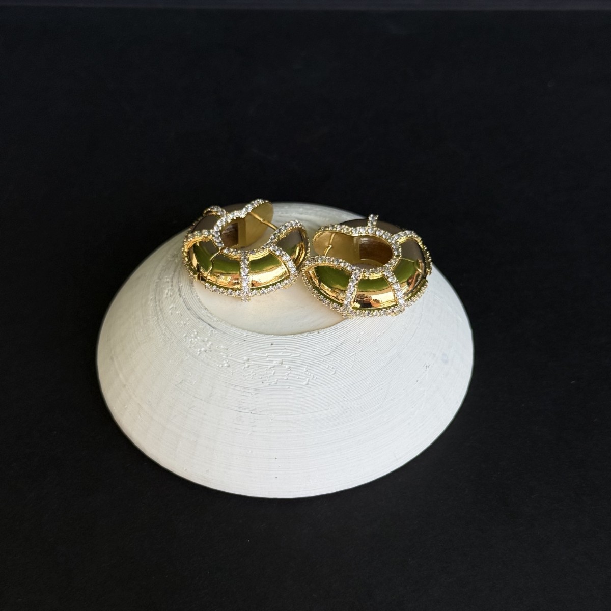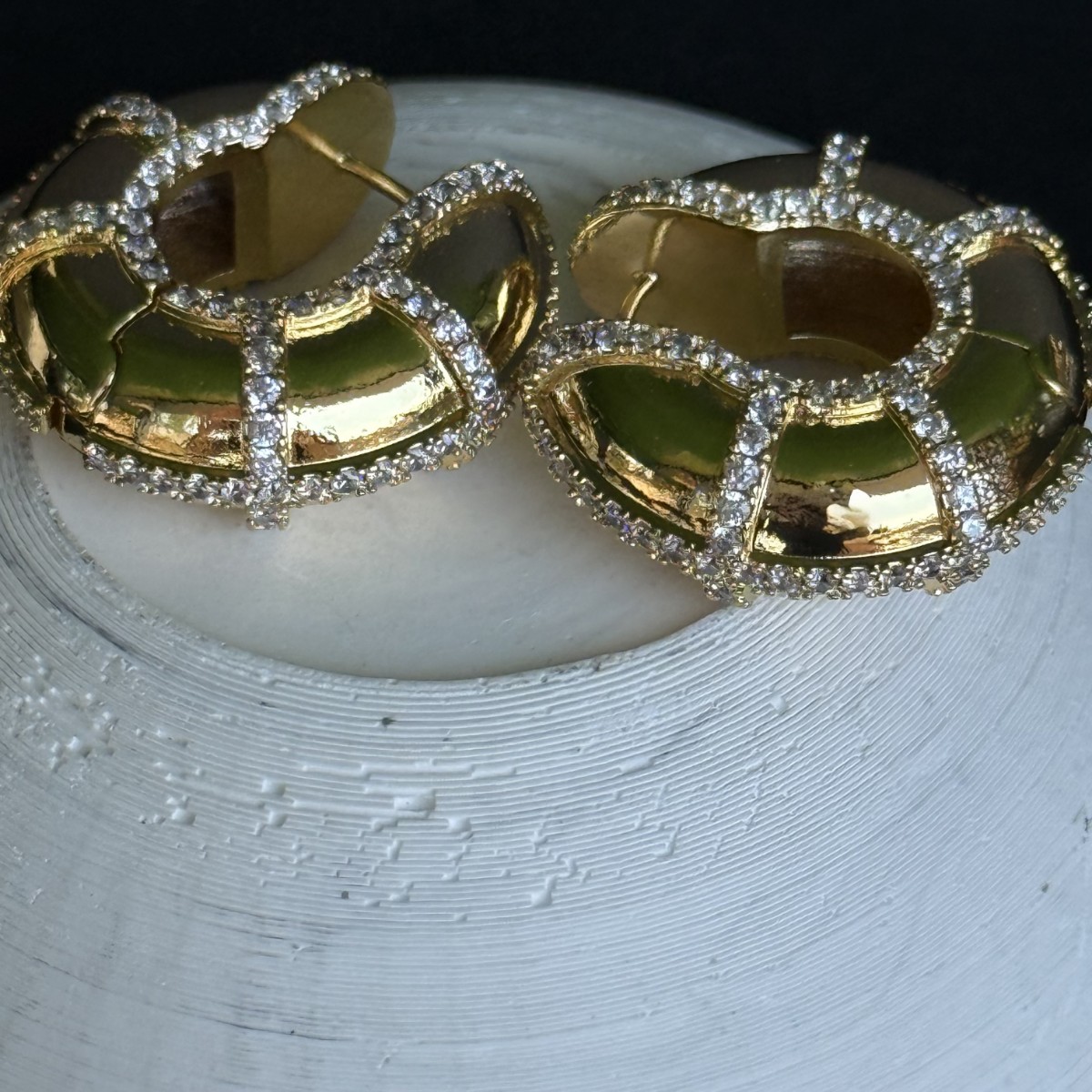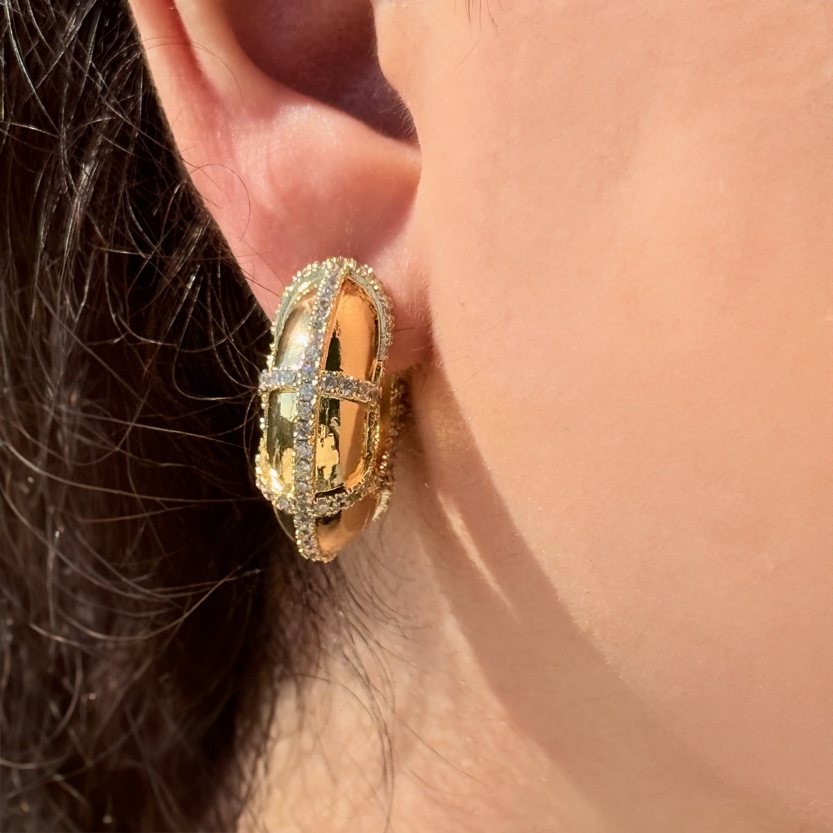 Parlak altın rengiyle dikkat çeken bu modern halka küpe, üzerindeki taşlı şerit detaylarıyla klasik halka küpelere farklı bir yorum katıyor. Gündelik kombinlerden gece şıklığına kadar çok yönlü kullanılabilir.