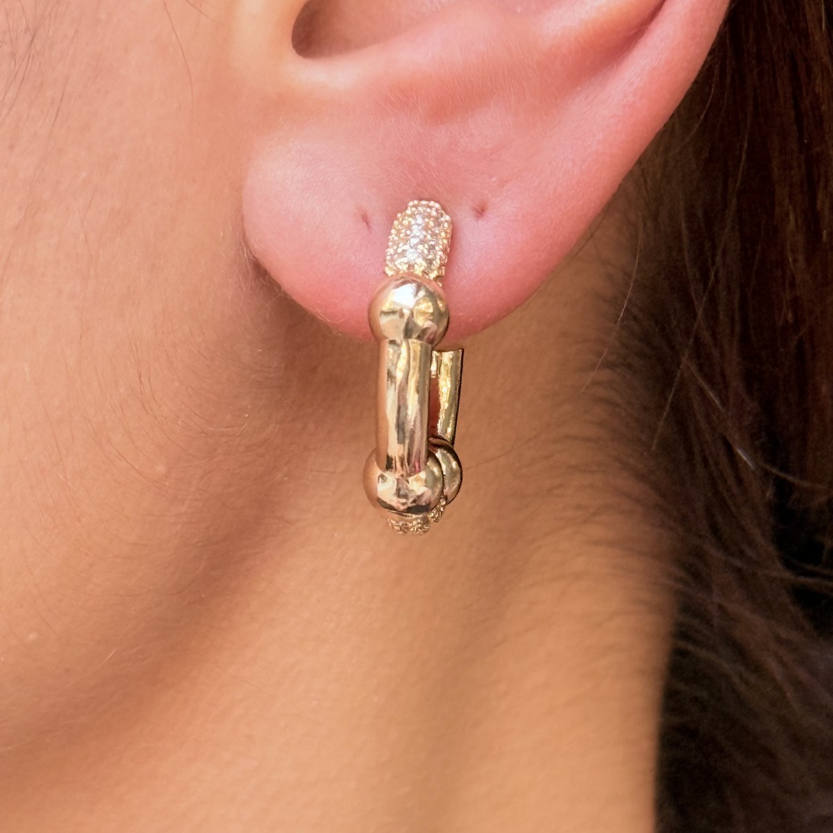 Altın blok formu ve taşlı uç detayları, güçlü ve sofistike bir ifade yaratıyor. Özgün tasarım severler için ideal.