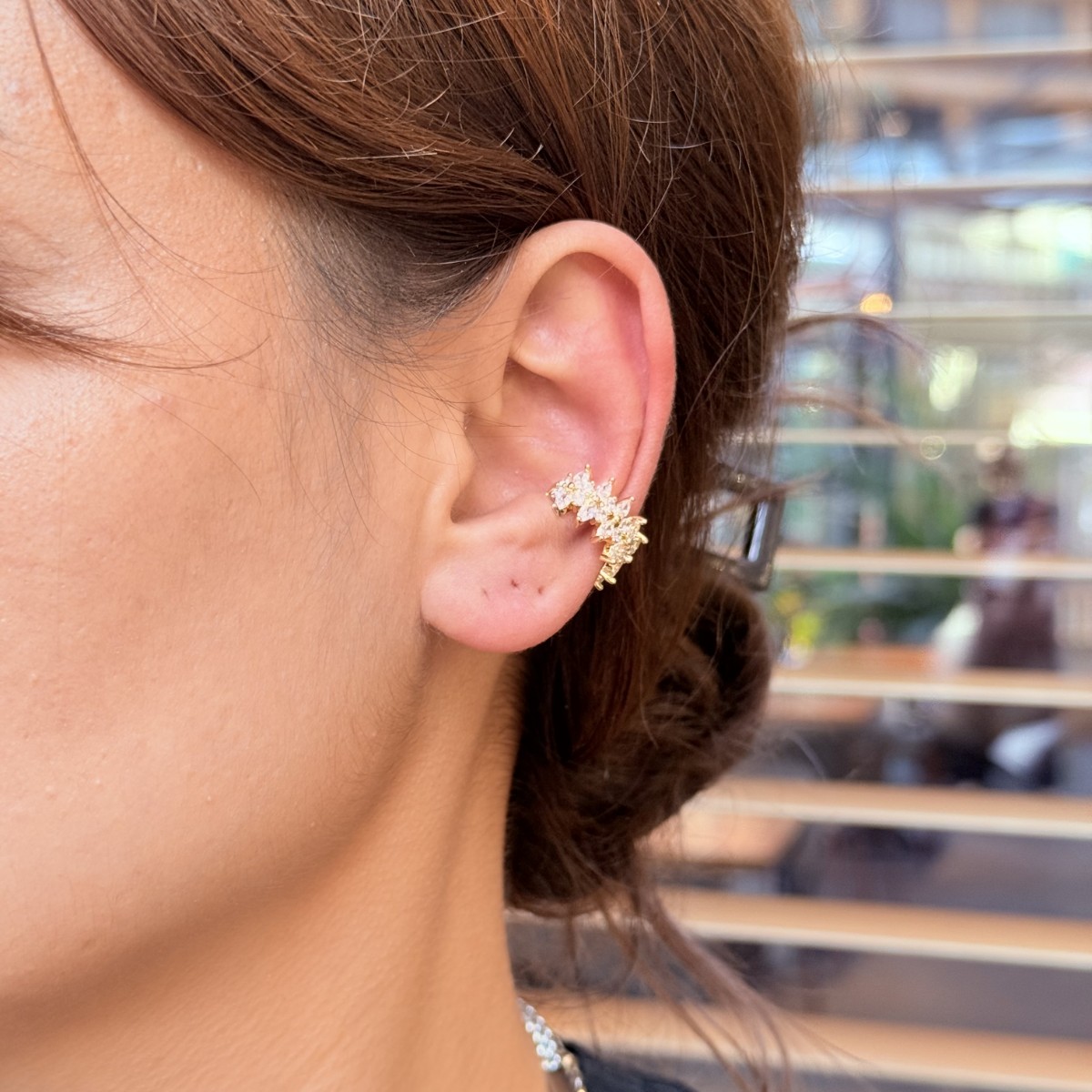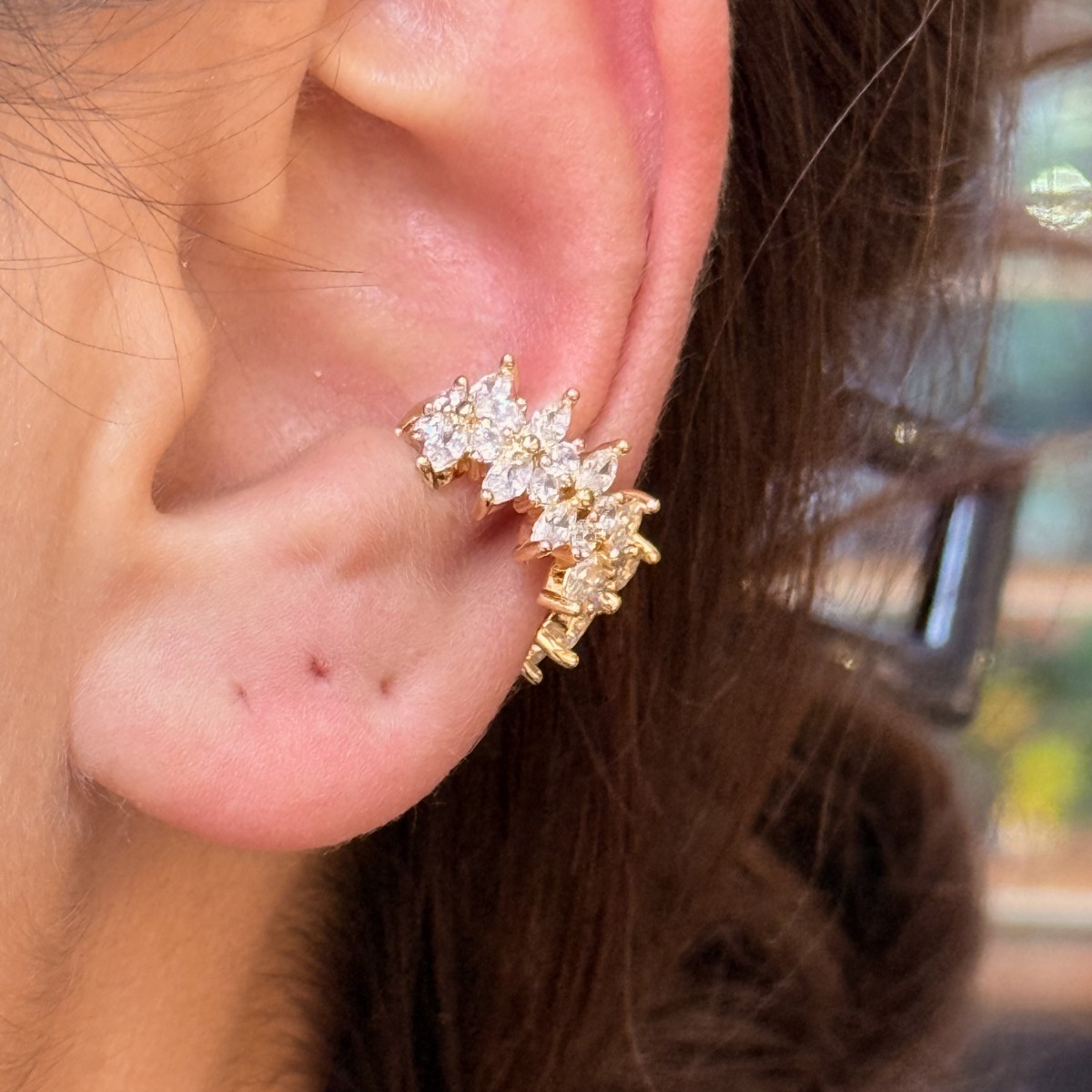 Birden fazla taşın çiçek formunda dizildiği bu kıkırdak, kulağınızı adeta bir bahçeye dönüştürüyor. Piercing gerektirmeden takılan bu model, hem günlük kombinlerde zarif bir hava katar hem de özel günlerde ışıldayan bir aksesuar olur