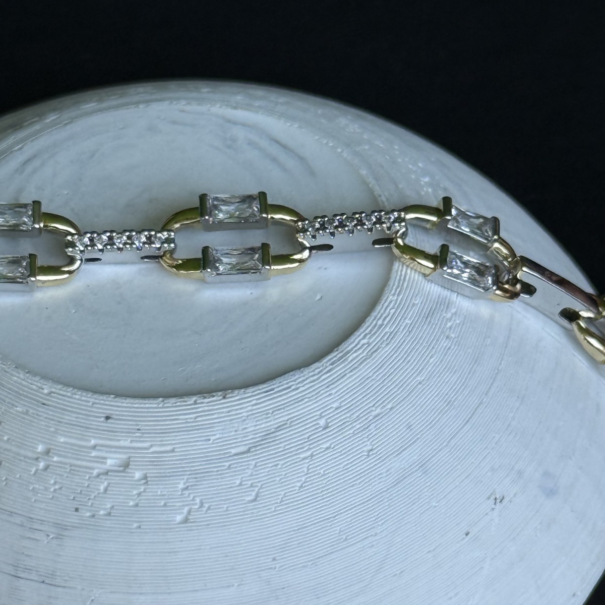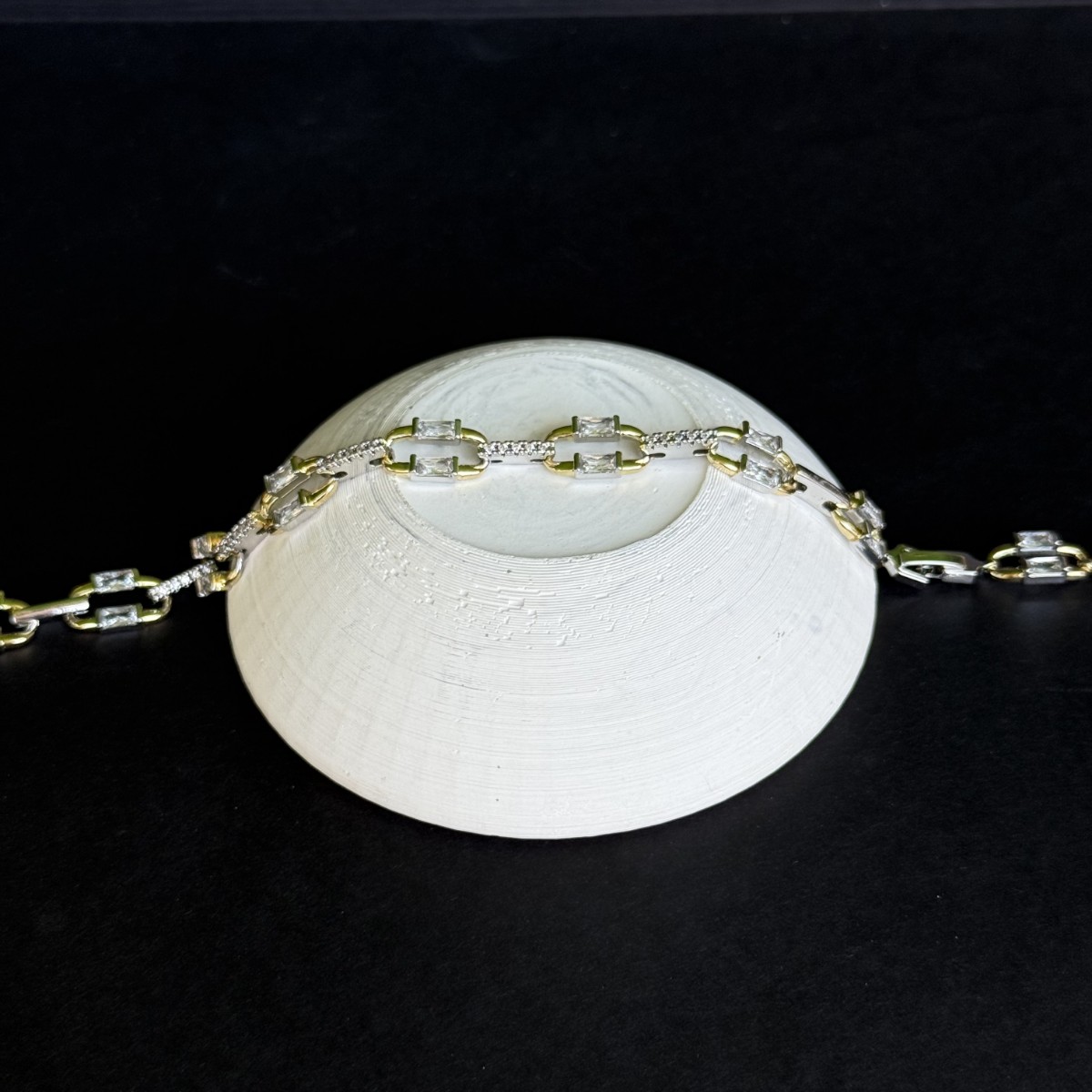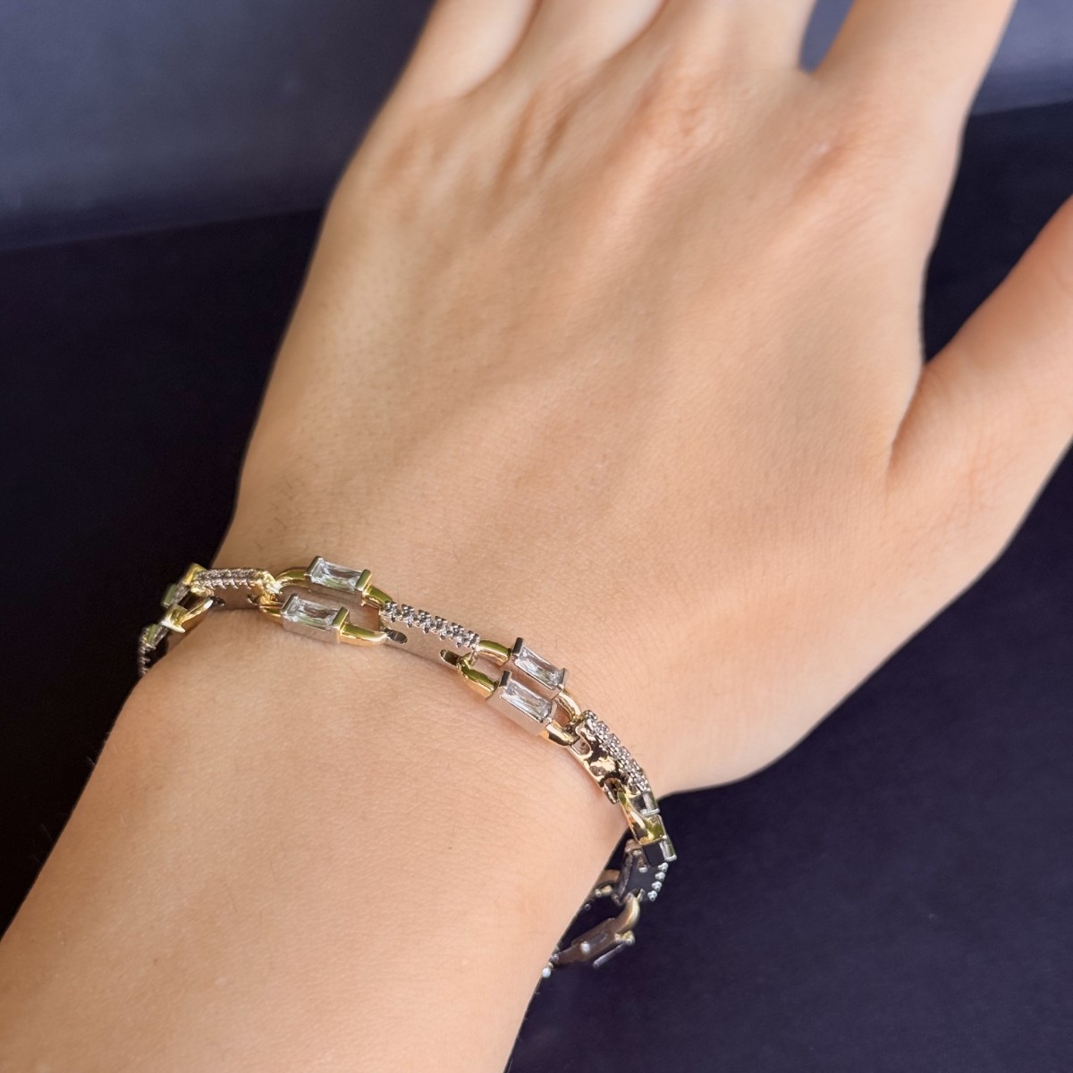 İnce işçilikle hazırlanmış bu bilezik, baget kesim taşların altın halkalarla birleşmesiyle oluşuyor. İkili formda tasarlanmış halkaların arasındaki baget taşlar, bileziğe zarif bir parlaklık katarken klasik şıklığı ön plana çıkarıyor.