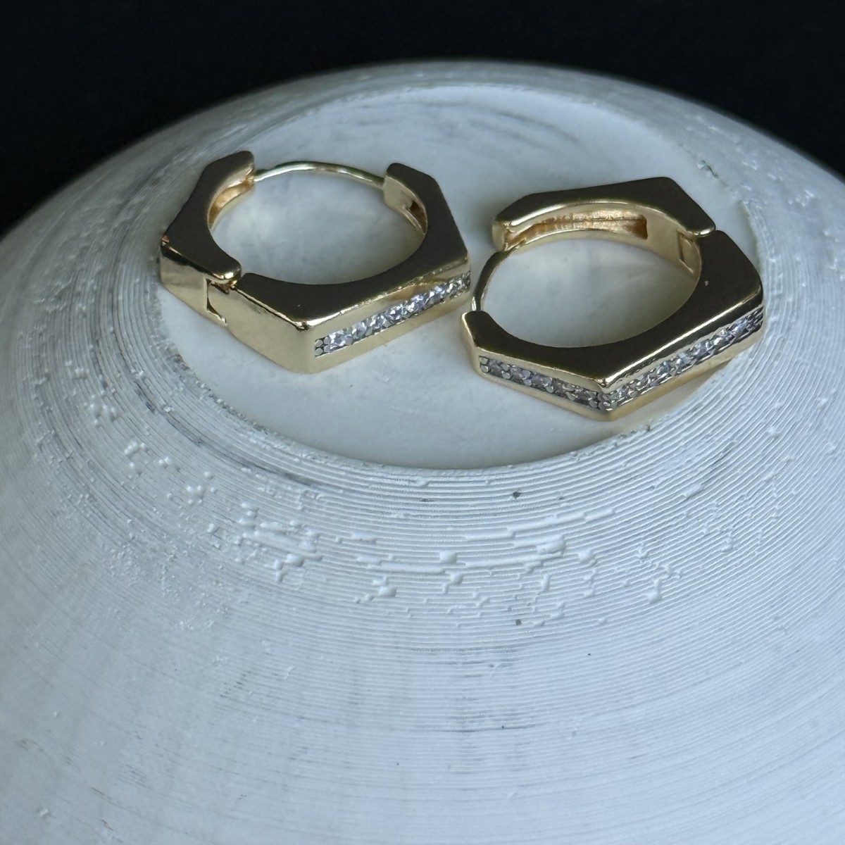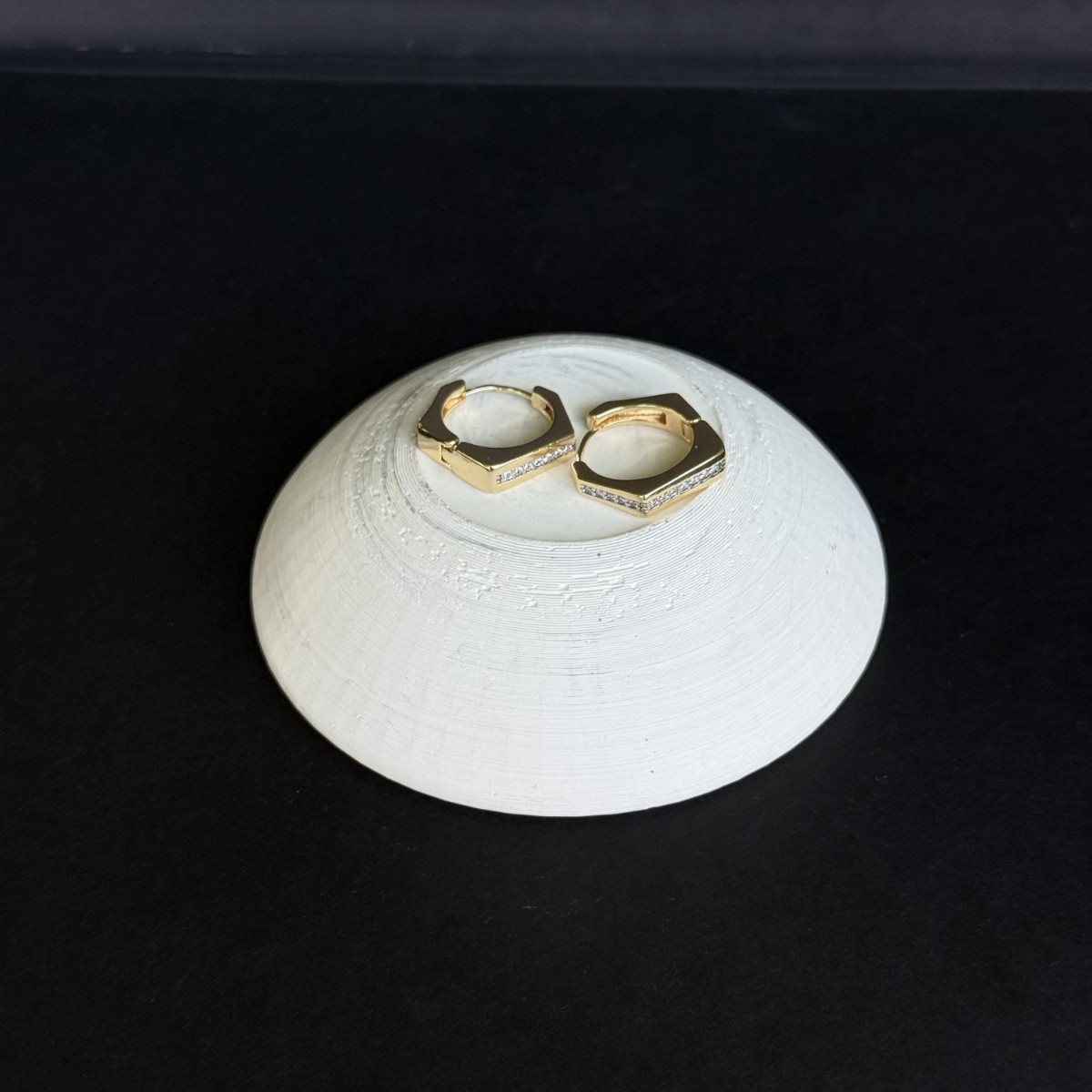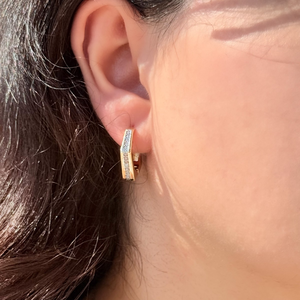 Açılı ve geometrik hatlara sahip bu model, beşgen benzeri bir form üzerinden yükselir. Taşlı çizgilerle güçlendirilmiş hatları kulakta modern ve keskin bir duruş kazandırır.