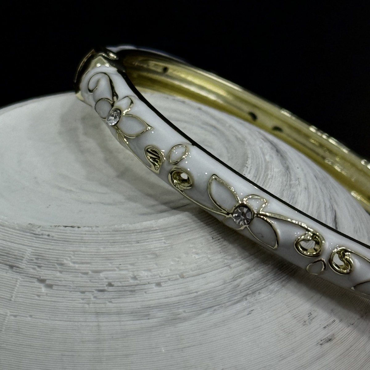 Beyaz mine üzerine işlenmiş altın çiçek motifleriyle dikkat çeken bu bileklik, Daisy Koleksiyonu’nun zarif ve modern çizgisini yansıtır. Paslanmaz çelik gövdesi sayesinde uzun süre parlaklığını korur.