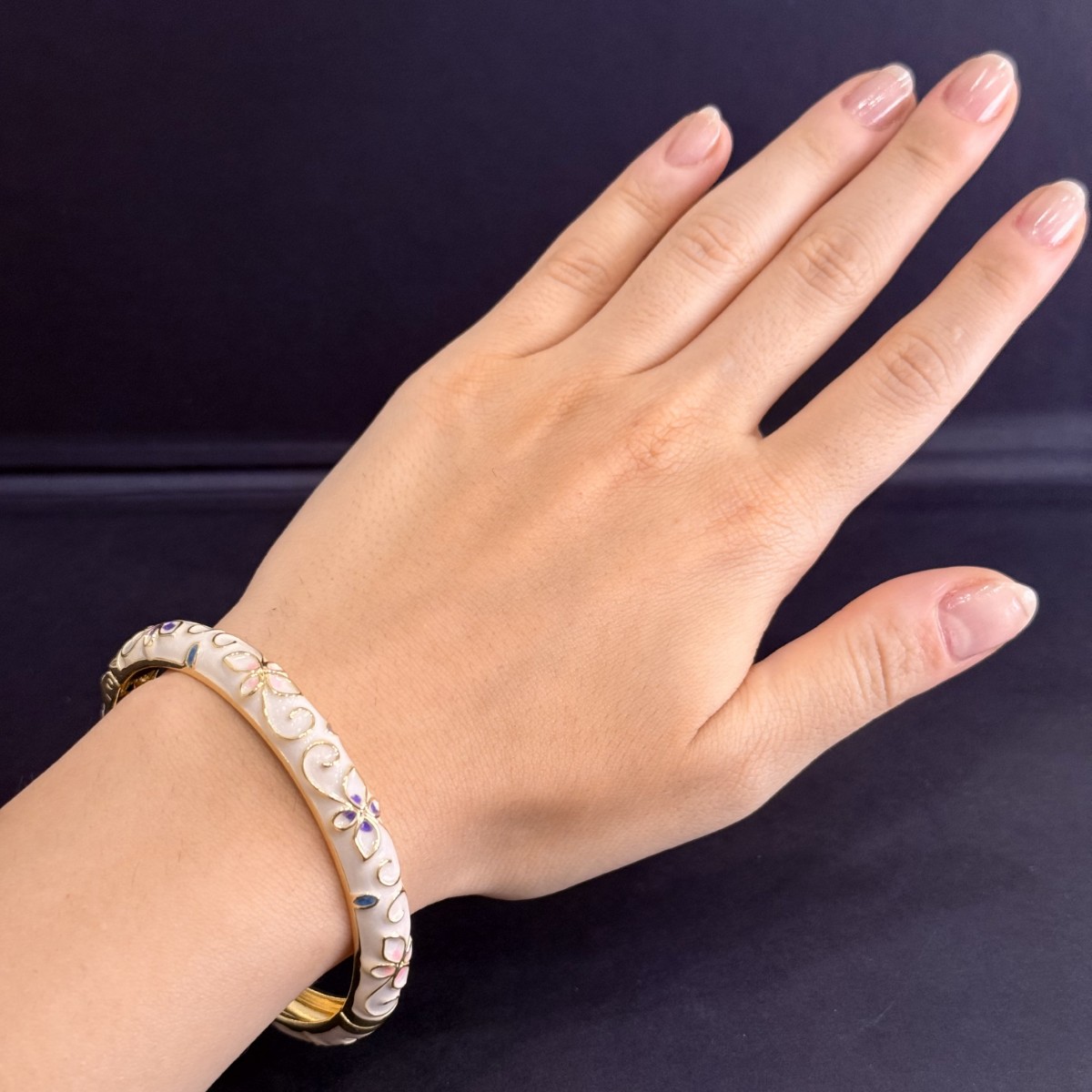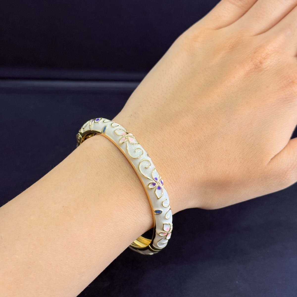 Beyaz mineli (enamel) zemin üzerine mor ve pembe çiçek motifleri ile işlenmiş bu zarif bileklik, altın tonlu kıvrımlı detaylarla hareket kazanır. Menteşeli kelepçe formu sayesinde bileğe kolayca takılır ve çıkarılır. Parlak mine kaplama uzun süre ilk günkü görünümünü korur.