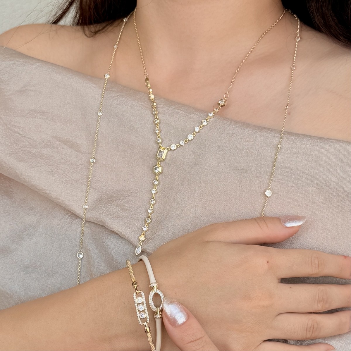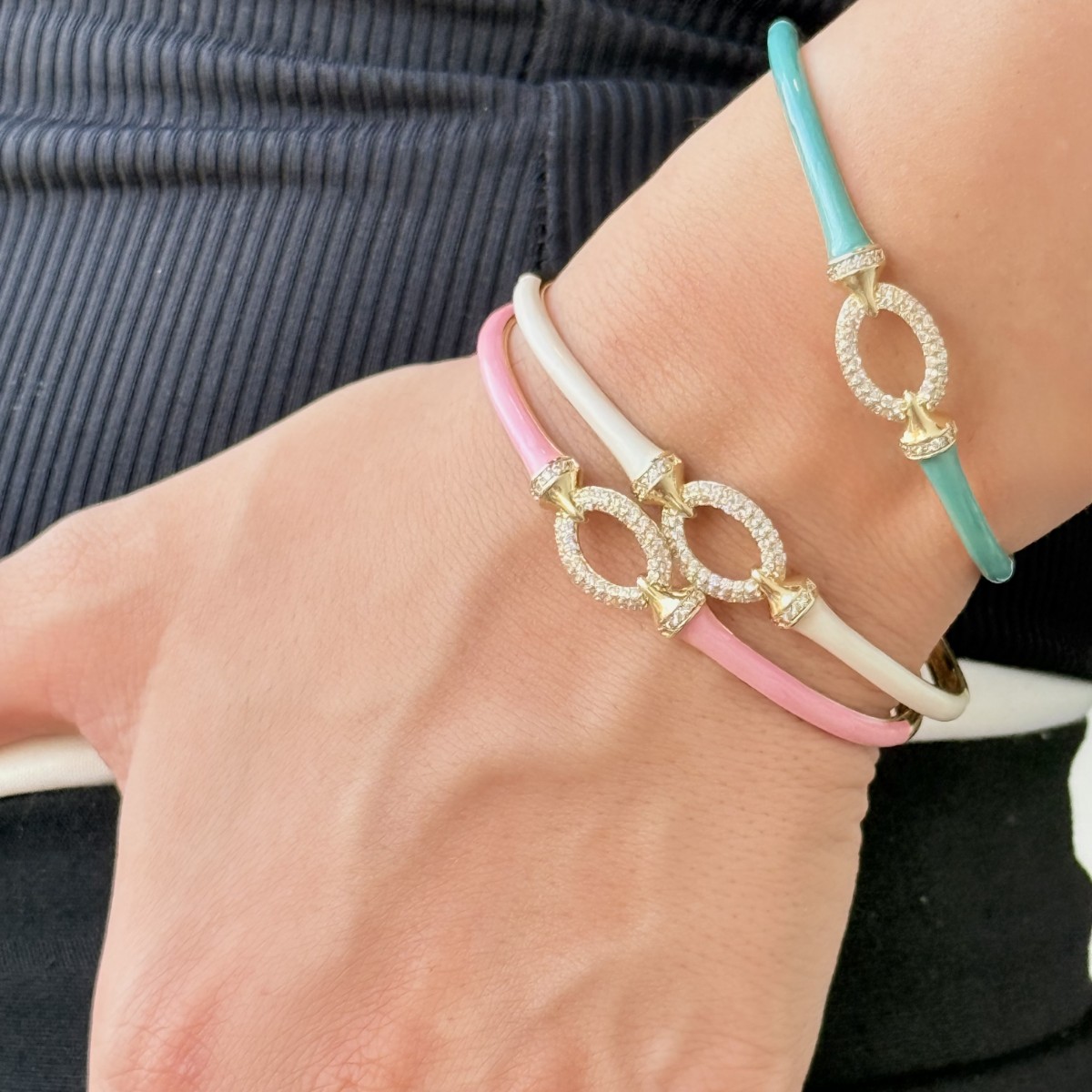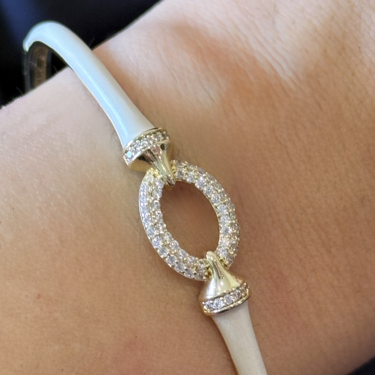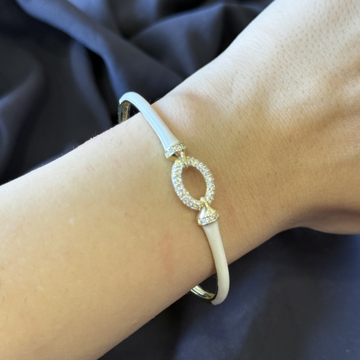 • Oval taşlı orta parça • Parlak beyaz kayış • Altın uçlar + taş detaylı bağlayıcı • Bileğin ölçüsüne göre ayarlanabilir yapı