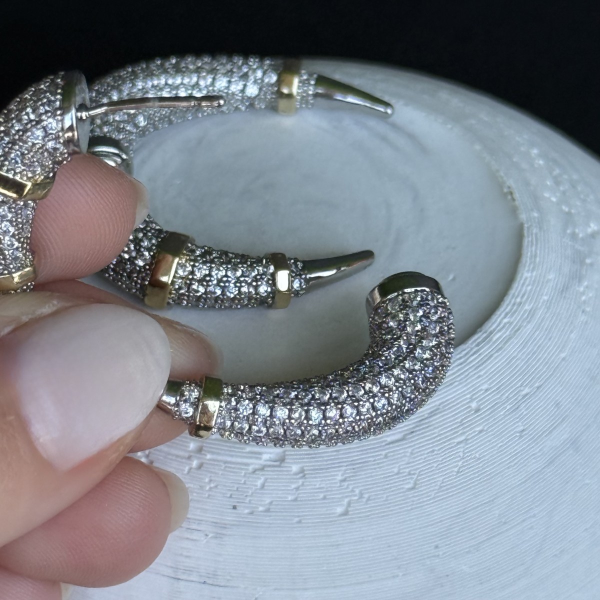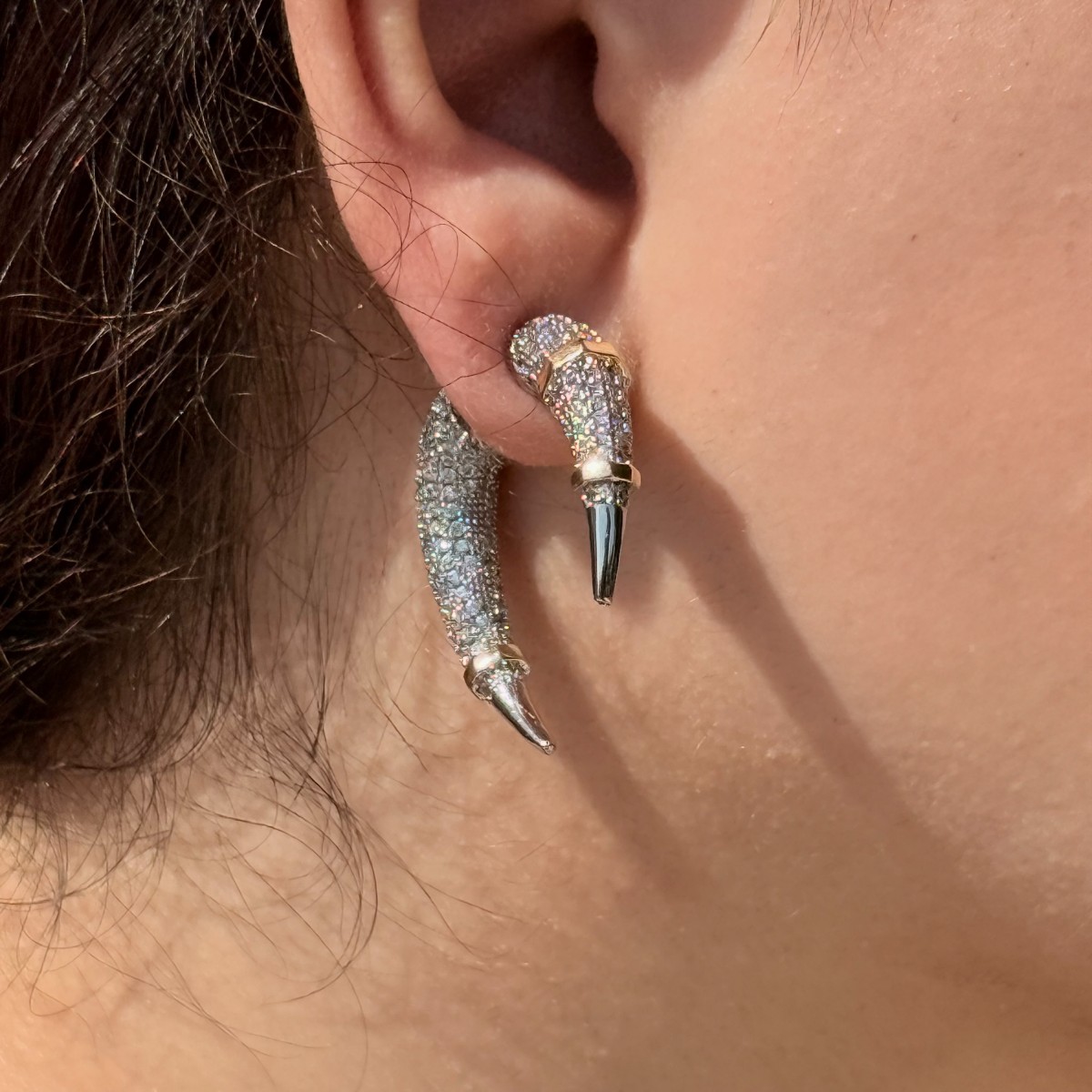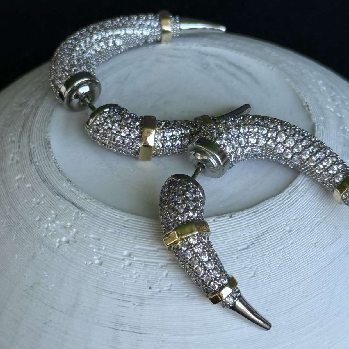 Kavisli “boynuz” formu komple pavé taşla kaplı; aralarda altın tonlu ince bantlarla bölümlenmiş. Uçlara doğru incelen siluet modern ve güçlü bir ifade verir.