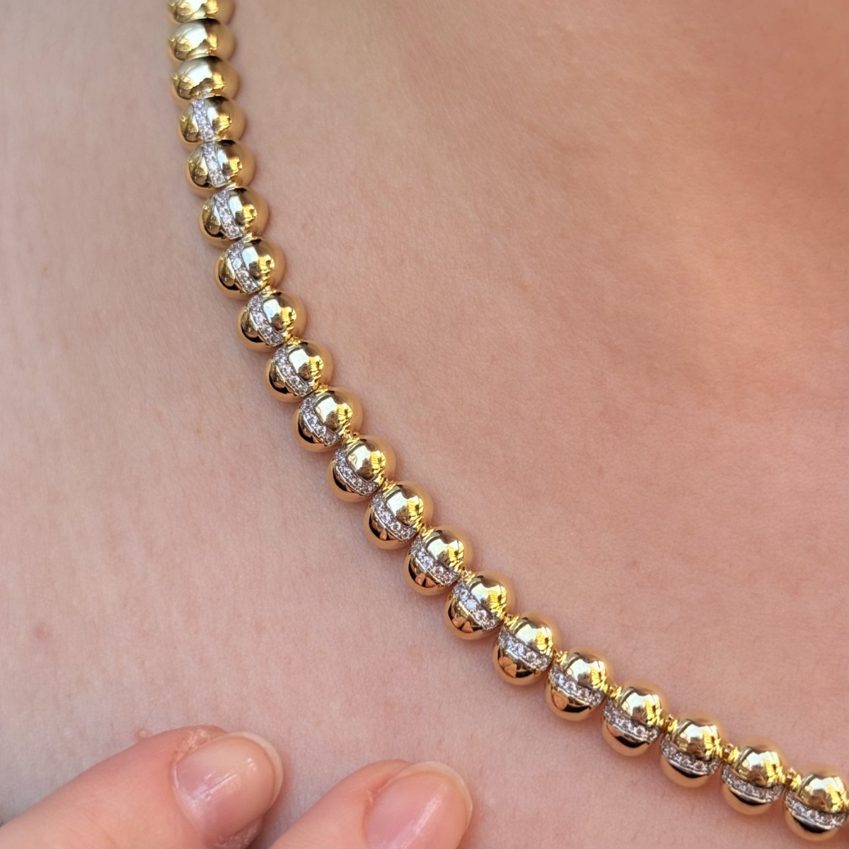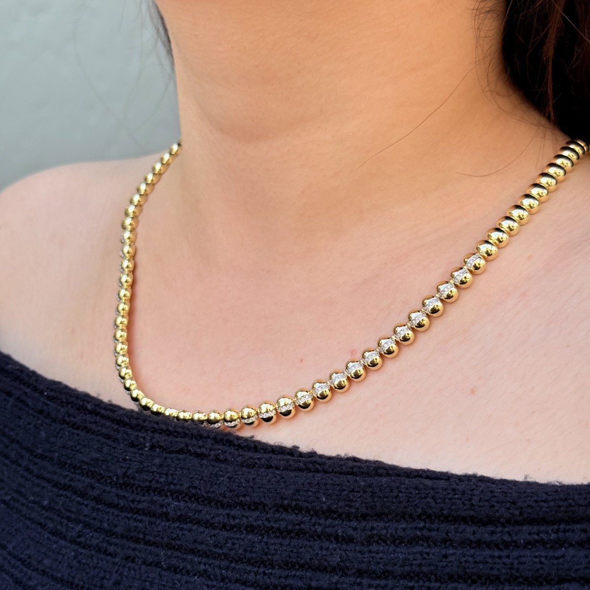 Yuvarlak metal boncukların sıralandığı parlak ve konforlu kolye.