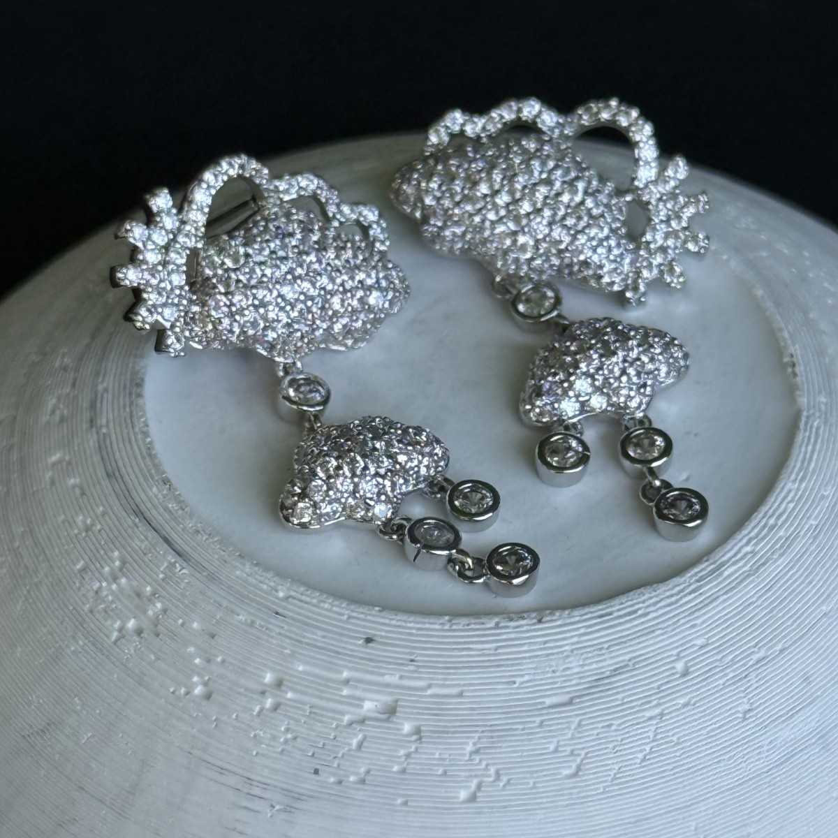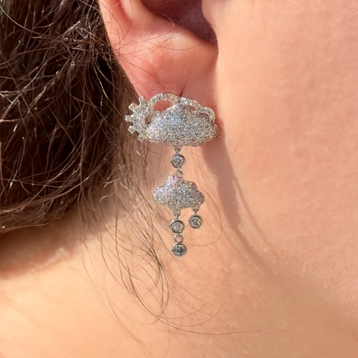 Bulut ve yağmur damlası tasarımıyla eğlenceli bir görünüm sunan bu küpe, taşların ışıltısıyla günlük şıklığa farklı bir dokunuş katıyor.