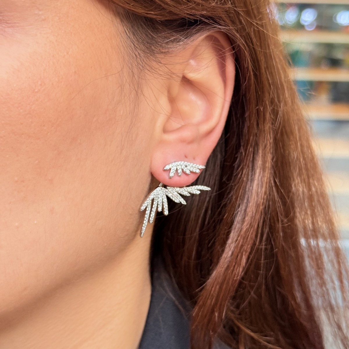 Işın saçan çift parçalı ear-jacket; üst parça mini ışık demeti, alt parça iri ve parlak taşlı kollar. Gümüş ton.