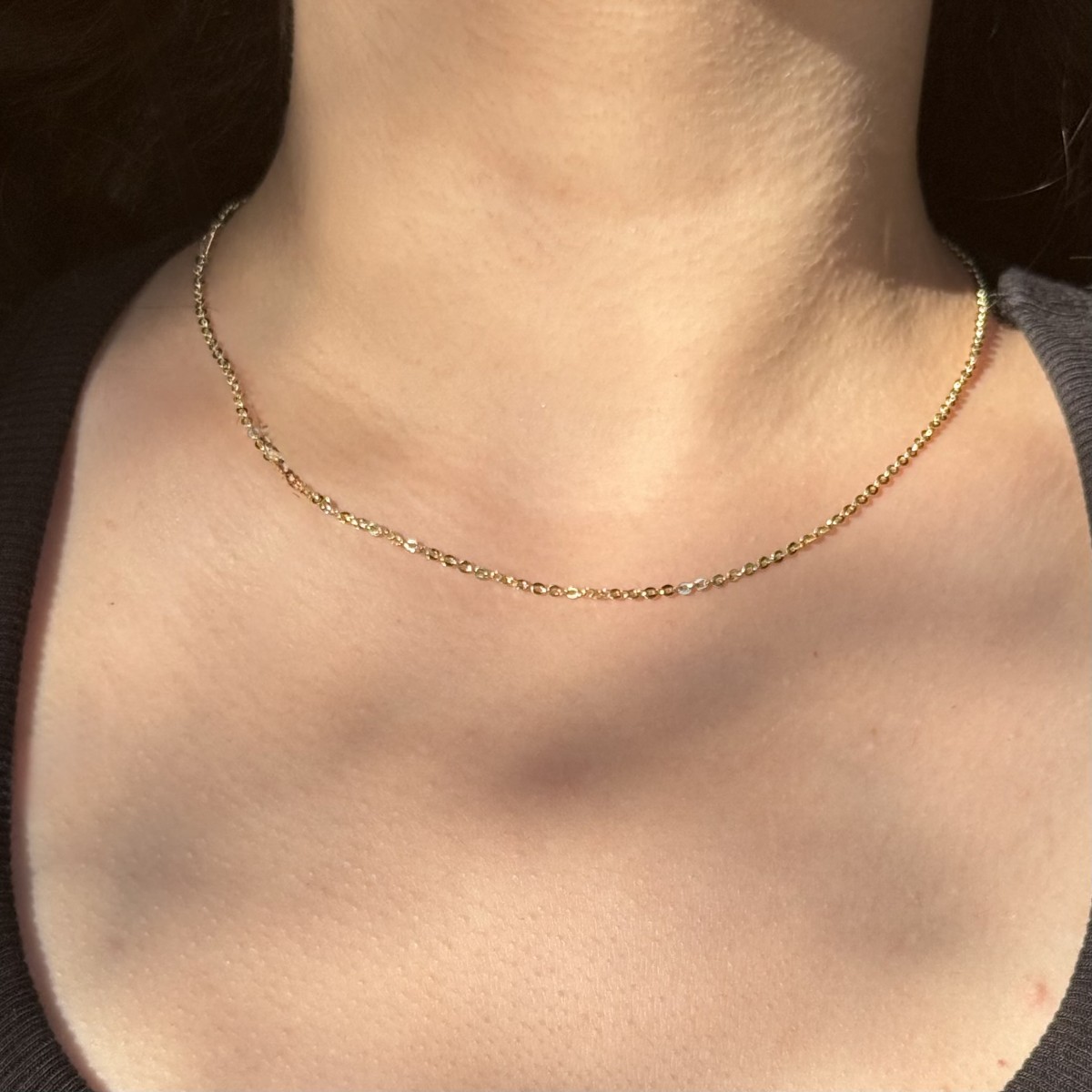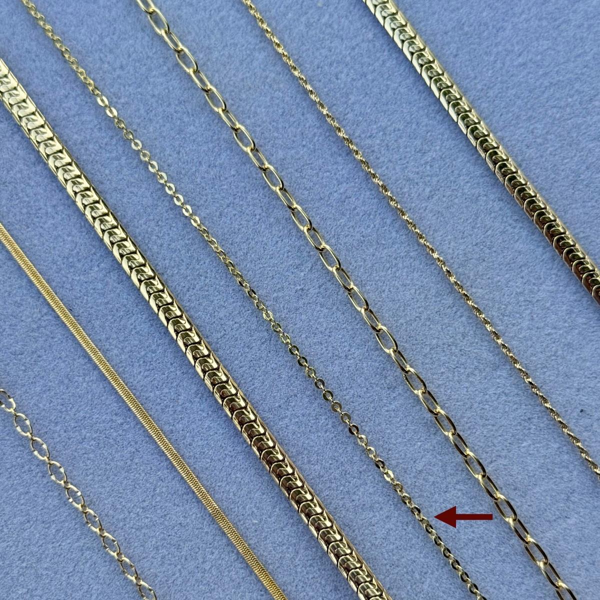 • Yuvarlak küçük toplar gibi birbirine eklenmiş halkalardan oluşur. • Her topun yüzeyi kesimli/parlak olduğu için ışığı çok yansıtır → bu yüzden fotoğrafta pırıl pırıl parlıyor. • İnce ve zarif durur, özellikle tek başına takıldığında çok şık bir ışıltı verir. • Diğer klasik düz halkalı zincirlerden farkı, yuvarlak boncuklu yapısıdır.