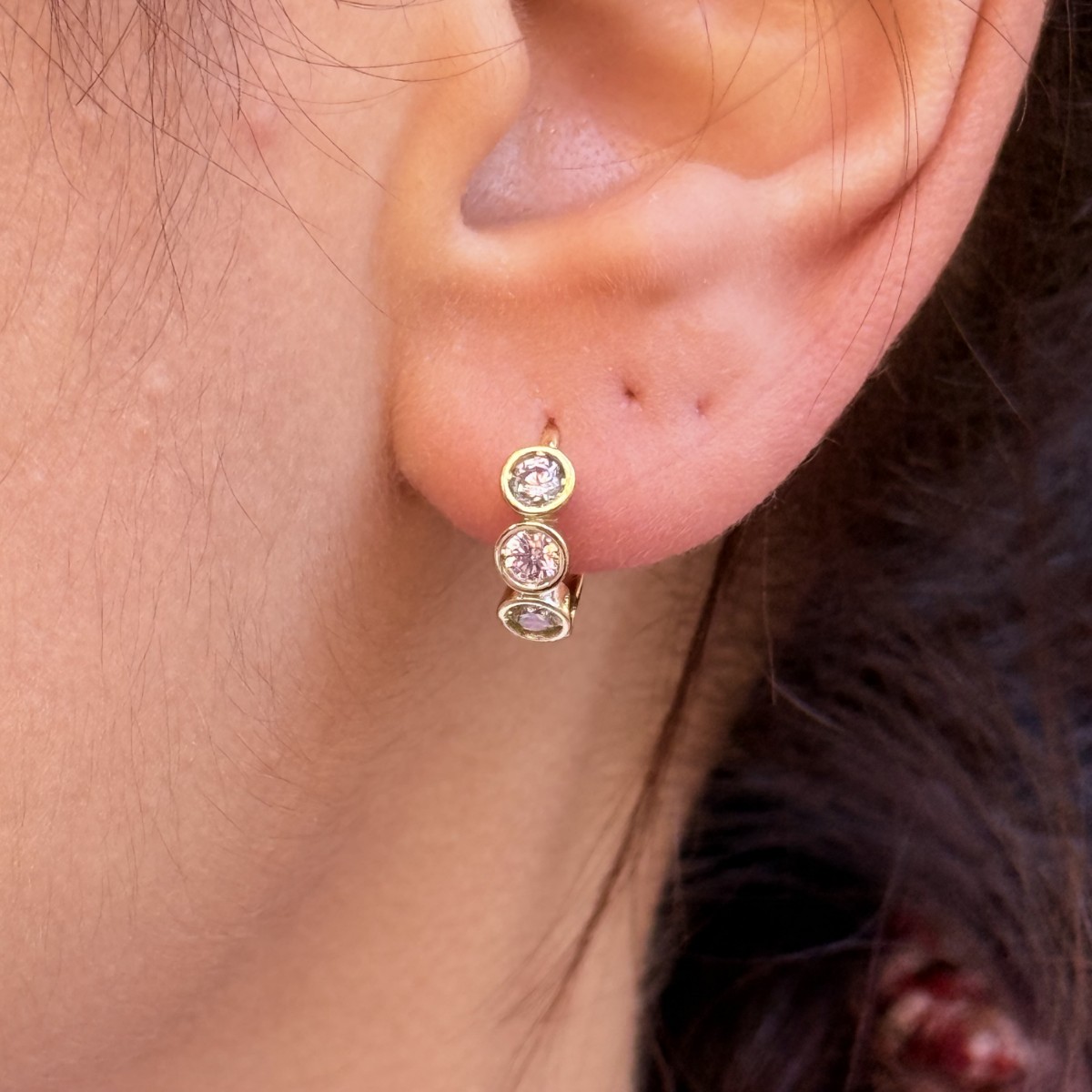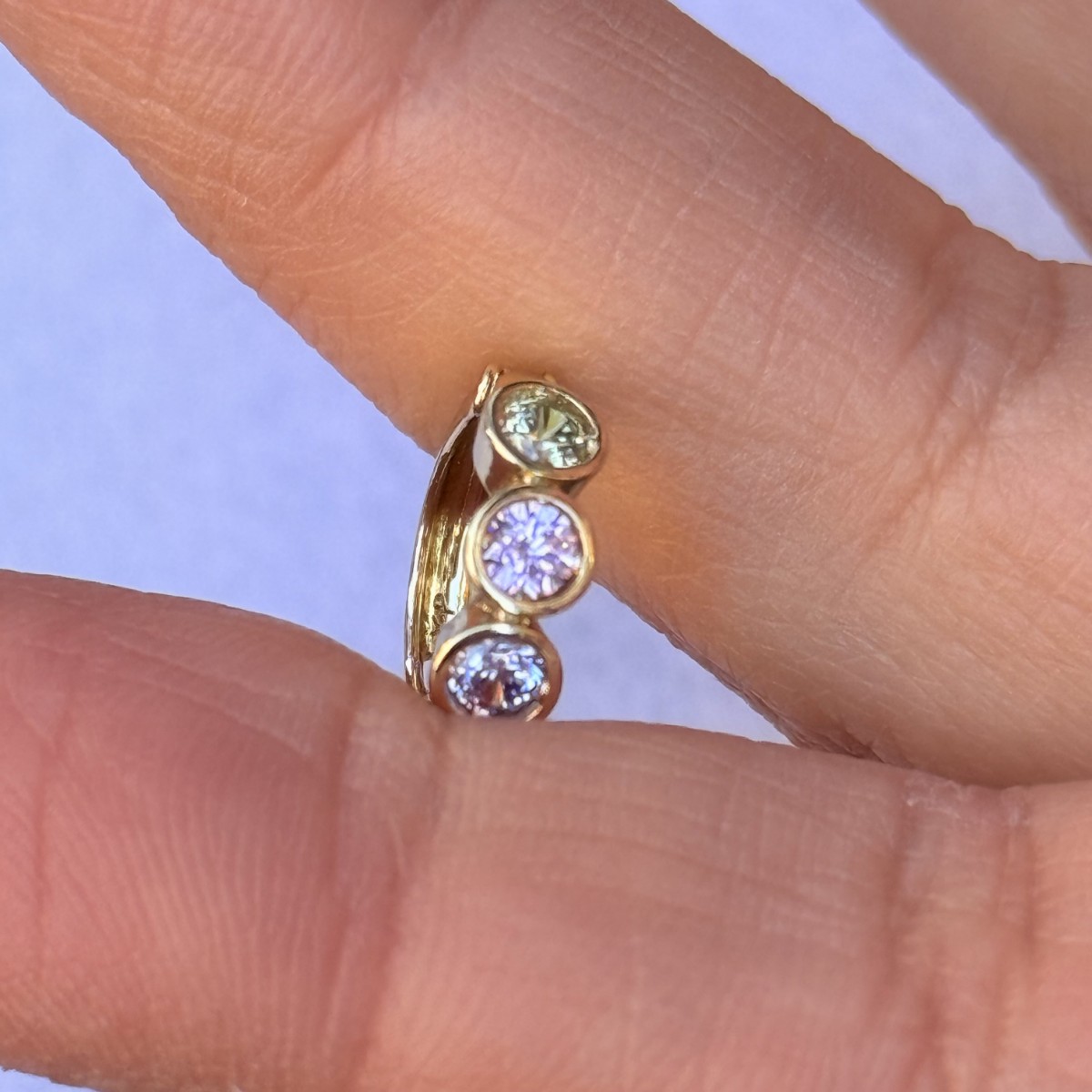 Gold – açık mor, mavi ve yeşil taşlı üçlü halka tasarımı.