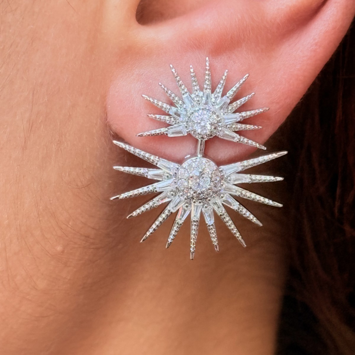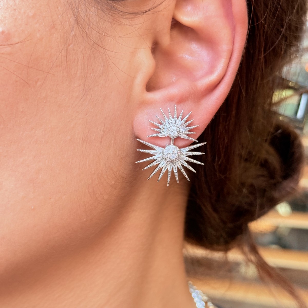Parıltısıyla bakışları üzerine çeken bu çift katmanlı güneş tasarımlı küpe, enerjik ve güçlü bir stilin tamamlayıcısı. Her bir ışın detayı, ışıltılı taşlarla işlenmiş olup, kulakta adeta modern bir sanat eseri gibi duruyor. Gece davetlerinden özel buluşmalara kadar iddialı bir görünüm için mükemmel bir seçim.