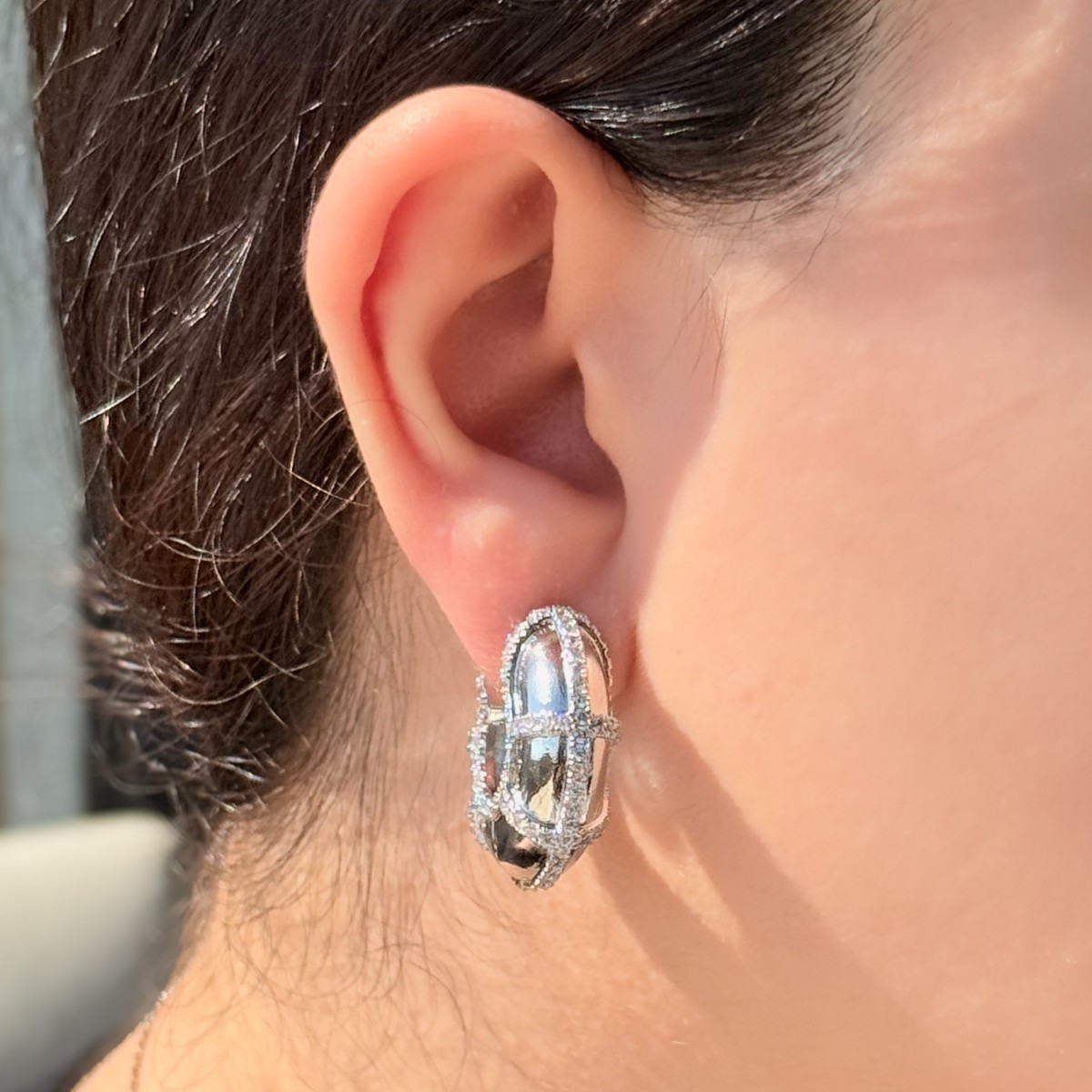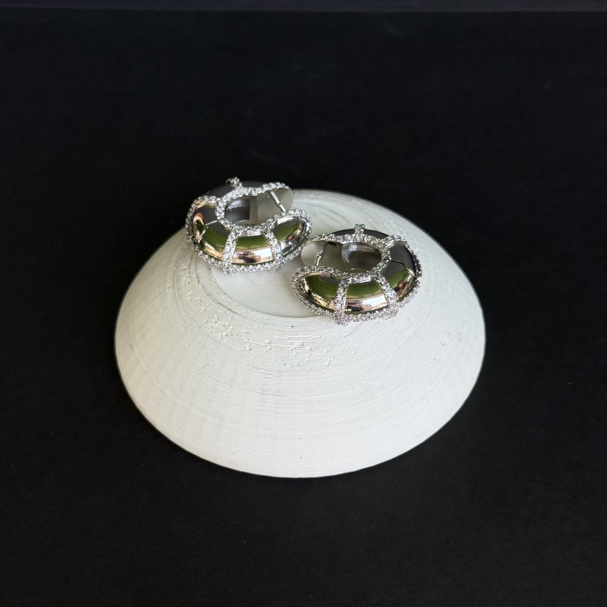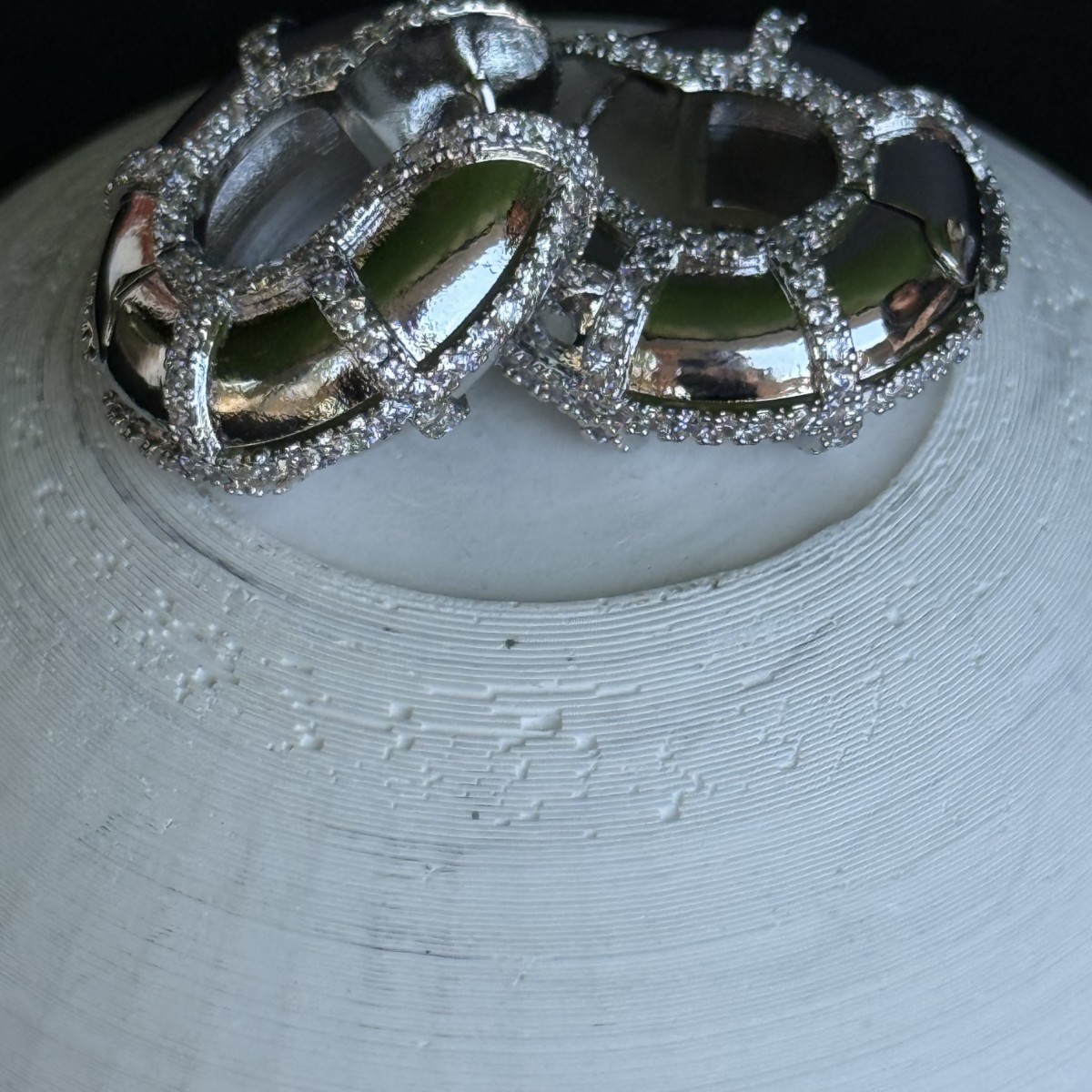 Parlak gümüş rengiyle dikkat çeken bu modern halka küpe, üzerindeki taşlı şerit detaylarıyla klasik halka küpelere farklı bir yorum katıyor. Gündelik kombinlerden gece şıklığına kadar çok yönlü kullanılabilir.