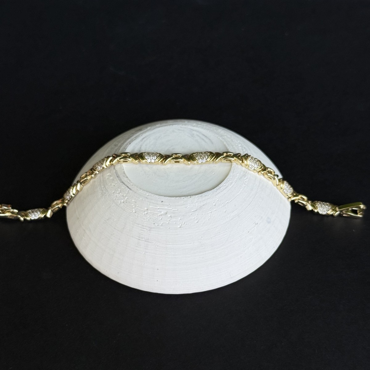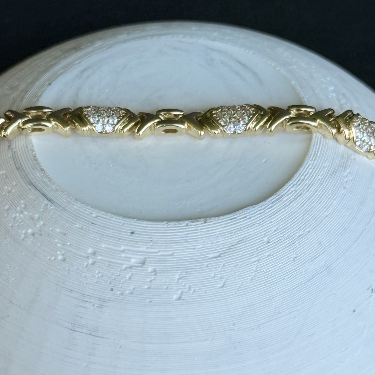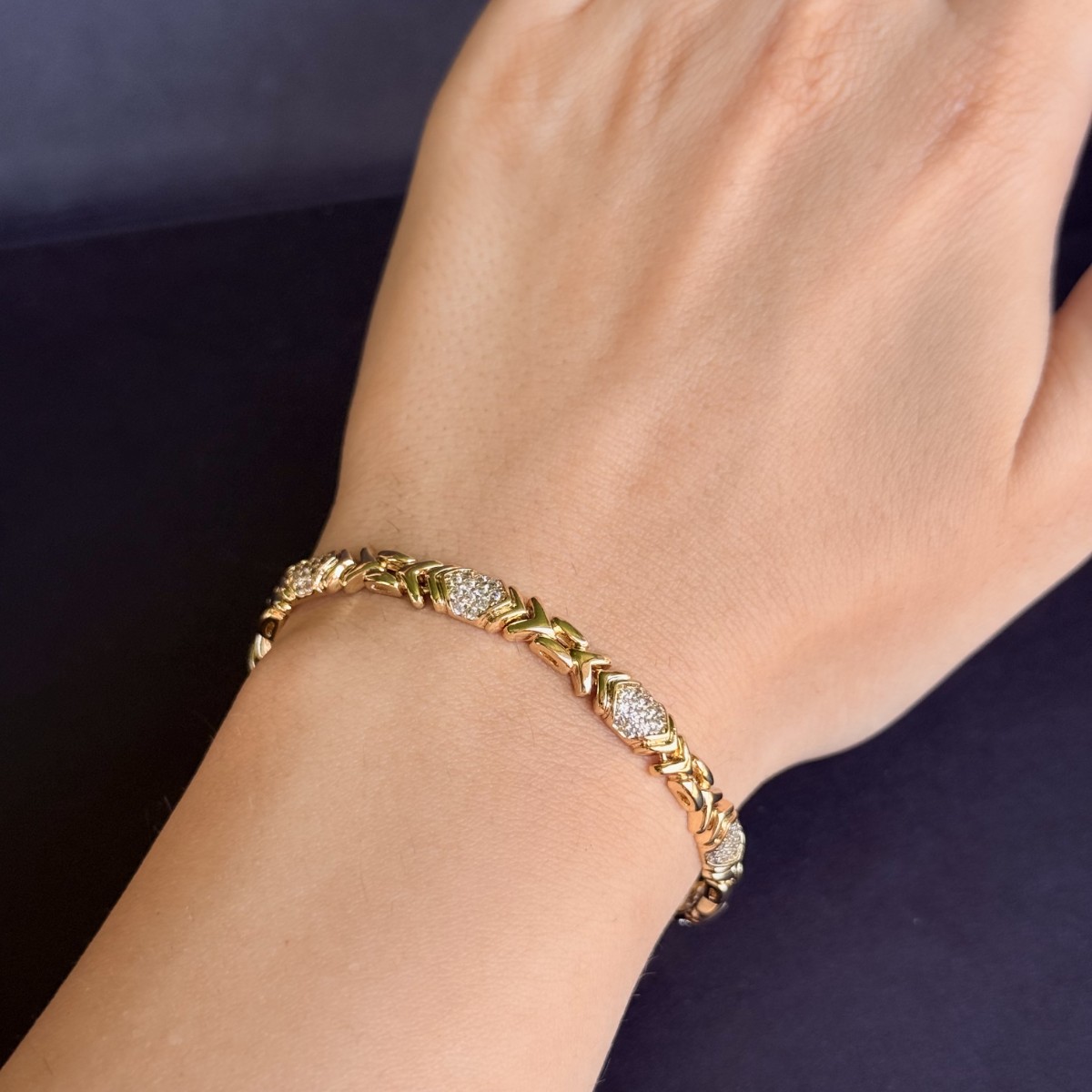 Altın sarısı zincir üzerine geometrik formlu taşlı parçalar eklenmiş. Spor-şık bir hava katıyor.