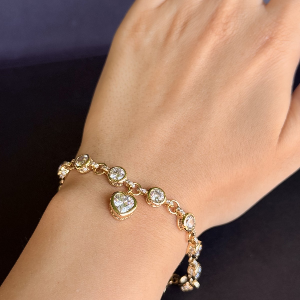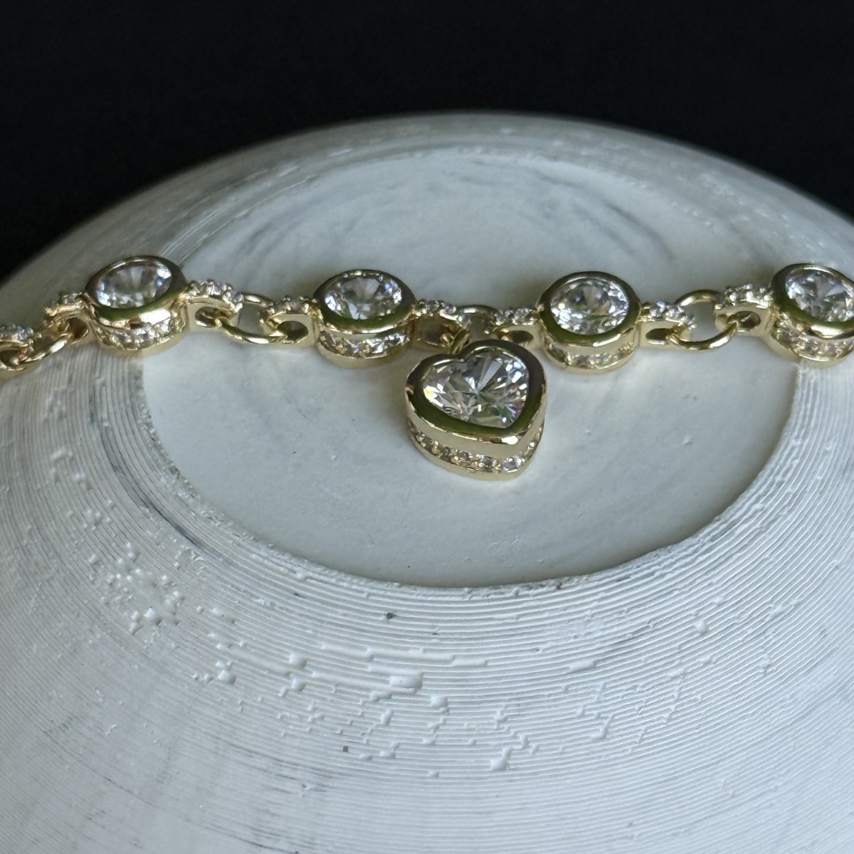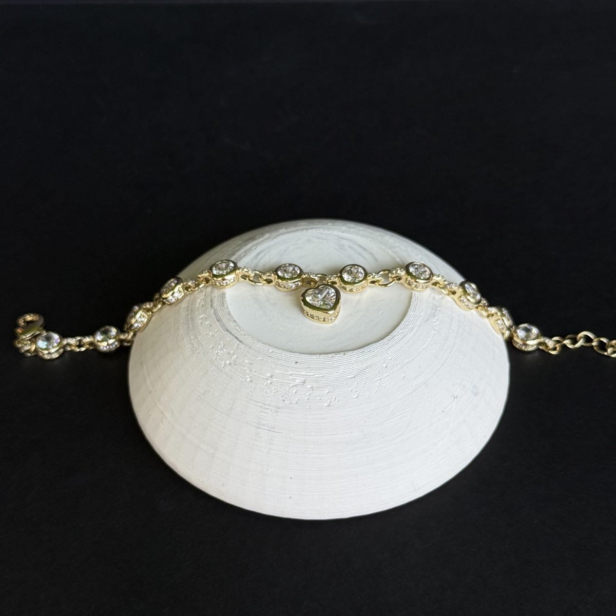 Altın tonlu zincir üzerine kalp formunda taşlı detay yerleştirilmiş. Romantik ve özel günler için ideal bir tasarım.