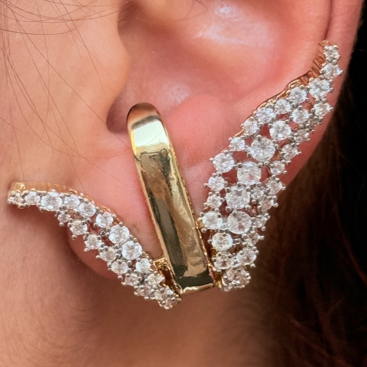Altın ton üzerine kanat formunda pırlanta dizaynıyla kulakta bütünleşen zarif tasarım.