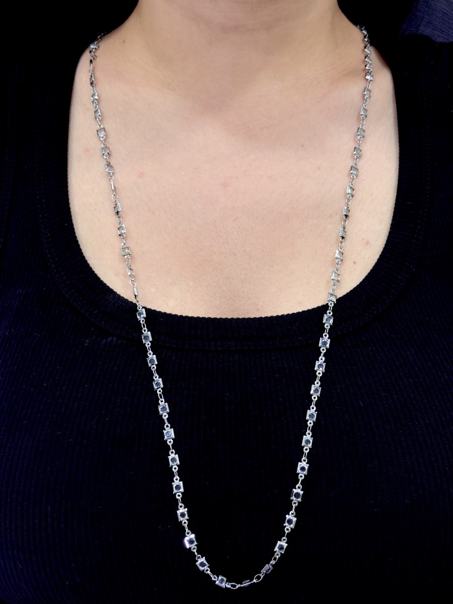 Kare formda taşlı detaylara sahip gümüş rengi kolye. Minimalist ama şık bir görünüm sağlar.