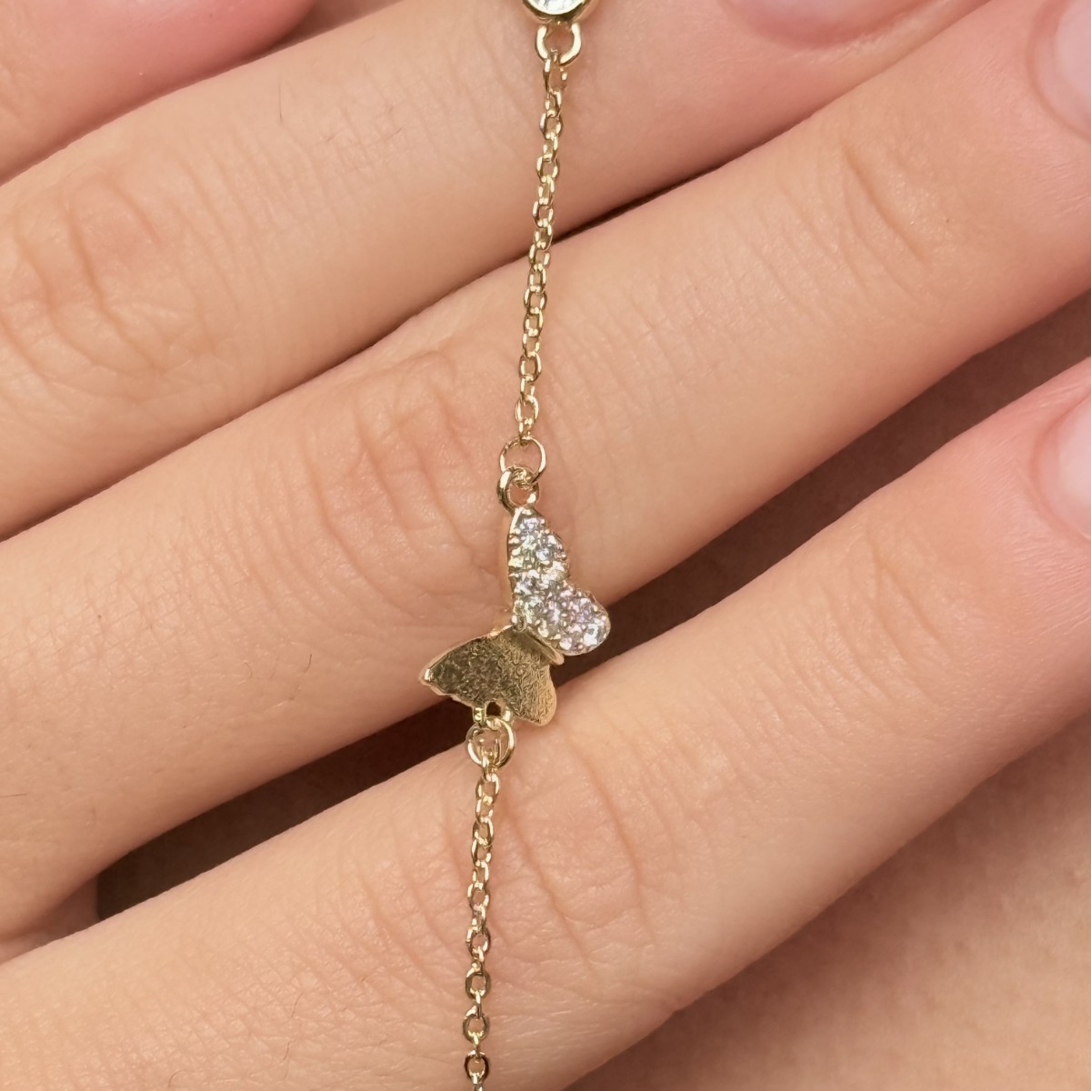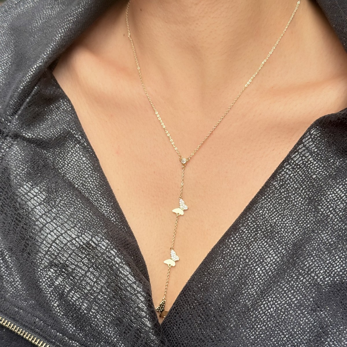 Üç minik kelebek detayıyla zarif bir hareket kazandırır. Zincirin aşağı doğru akışı dekolteyle uyum sağlar, feminen ve hafif bir görünüm sunar.