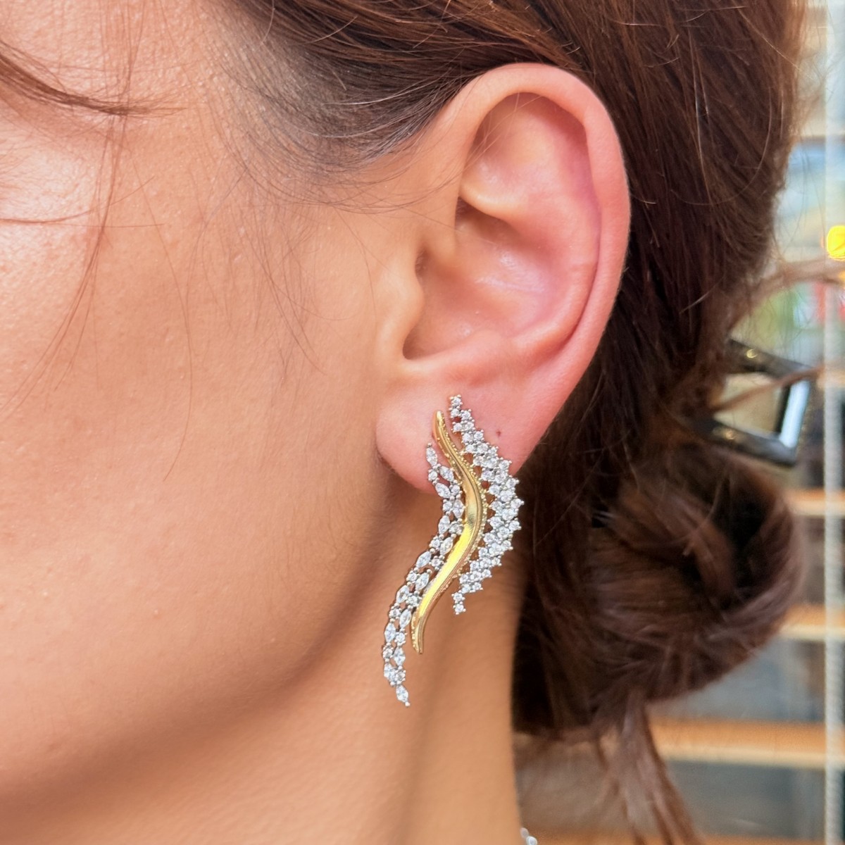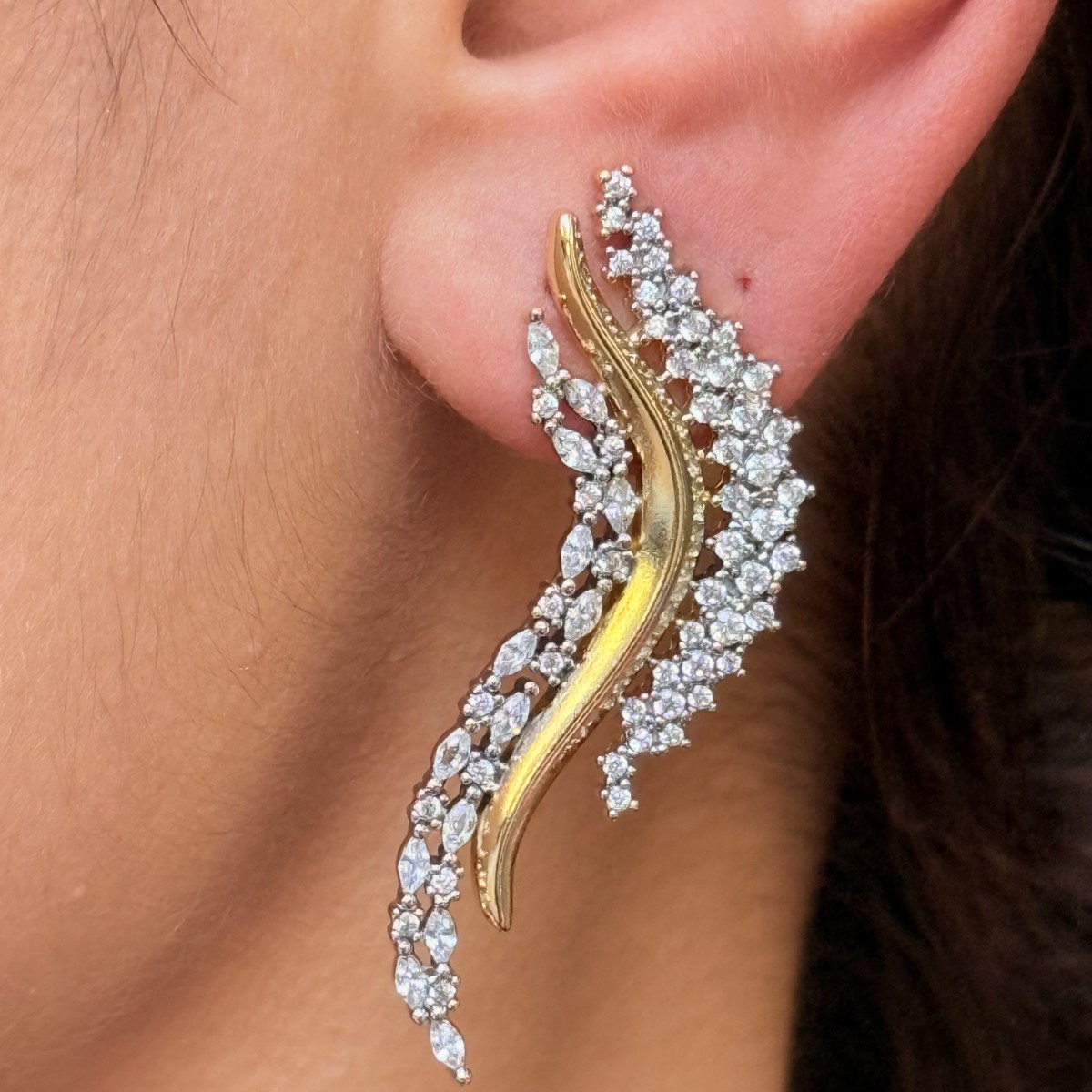 Altın formun etrafında yükselen pırlanta görünümlü taşlar, dalga hissi vererek kulağınızda ihtişamlı bir hareket yaratır. Özel günler için kusursuz bir seçim.