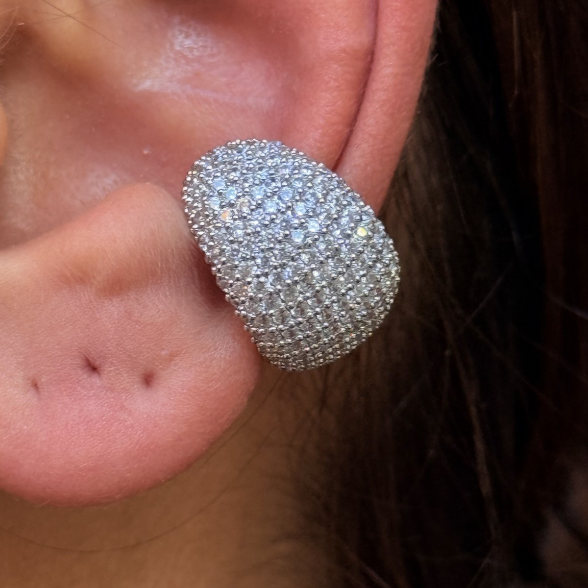 Taşların dalgalı şekilde işlenmesiyle tasarlanan bu kıkırdak, kulakta hareket ettikçe ışığı kırarak farklı açılardan parlıyor. Şık, modern ve dikkat çekici bir tasarım.