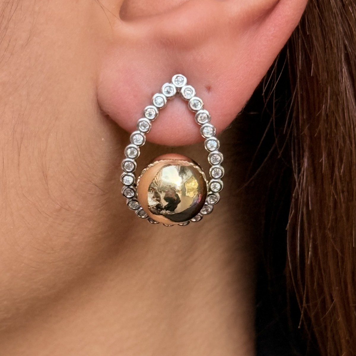 Damla çerçeve içine yerleştirilmiş parlak küre; retro-modern kontrast.
