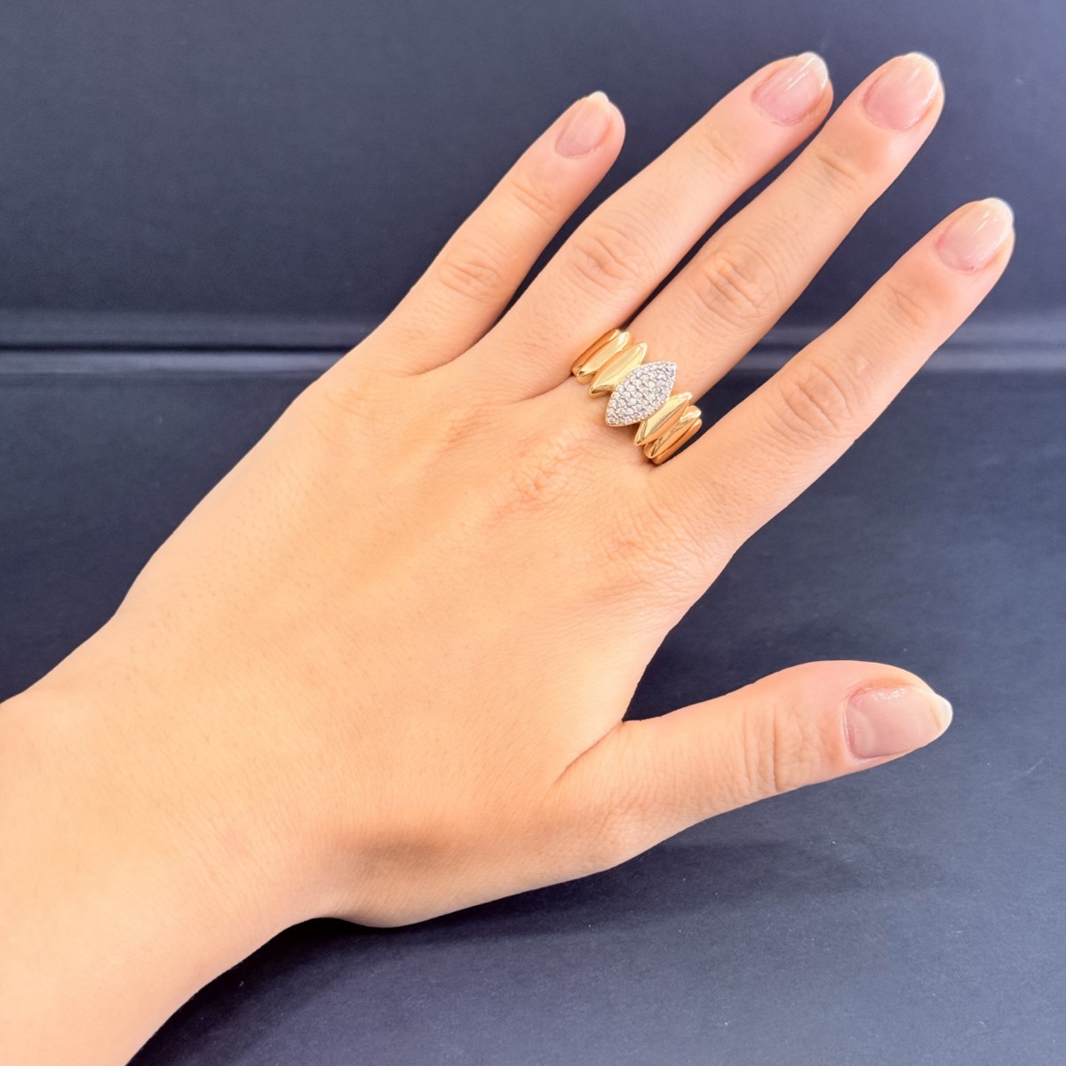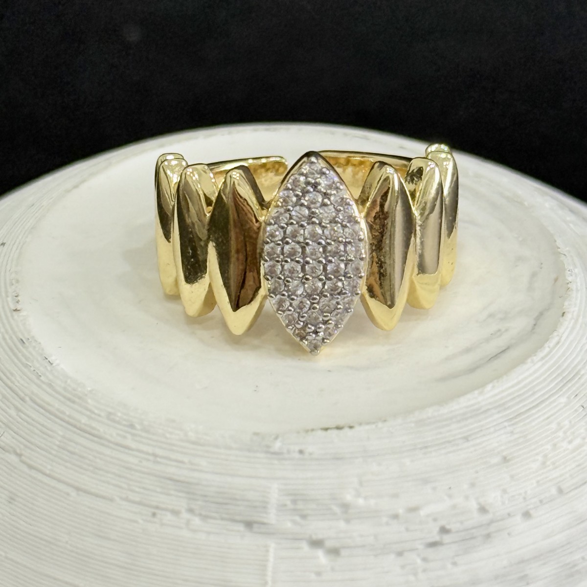 Marquise Taşlı Modern Yüzük, özgün formuyla göz kamaştırır. Orta kısımdaki marquise (baklava kesim) taş, altın tonlu gövdeyle kusursuz bir uyum yakalar.