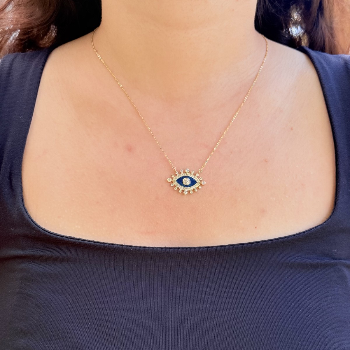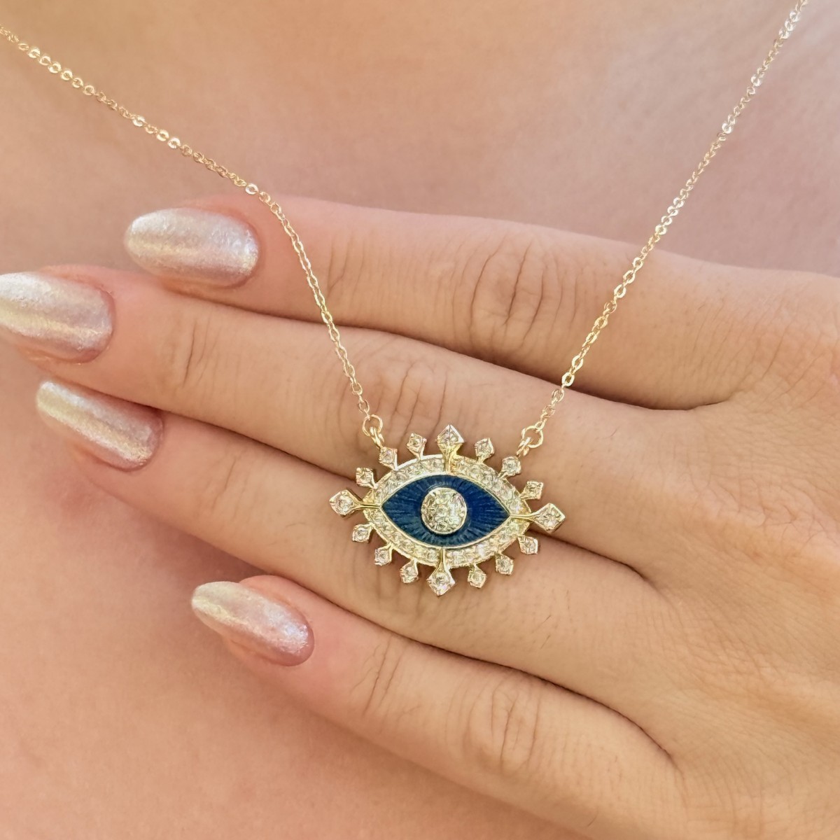 Gösterişli mavi göz motifiyle hem koruyucu hem de estetik bir parça. Taşlı detayları sayesinde boynunuzda ışığı mükemmel şekilde yansıtır.