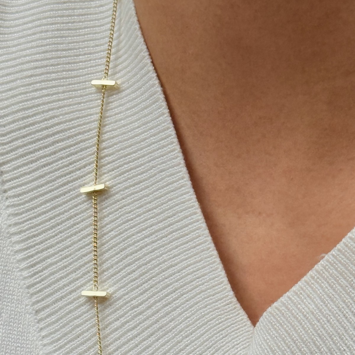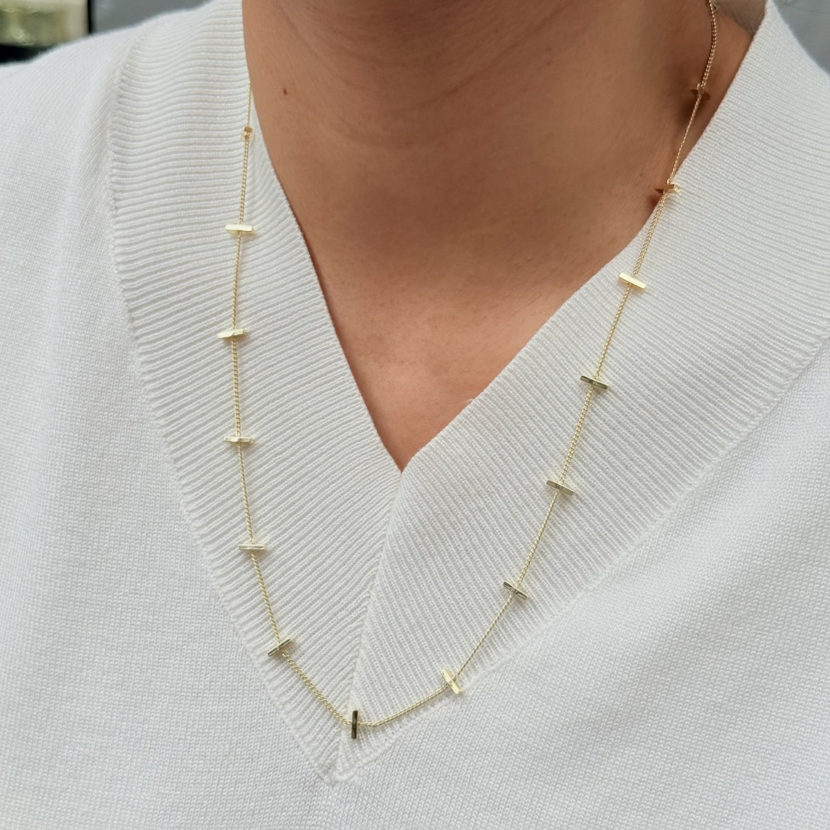 İnce zincir üzerine yerleştirilmiş küçük altın çubuk detaylarıyla modern ve zarif bir görünüm sunar. Günlük kombinler için hafif, özel günler için şık bir tamamlayıcıdır.