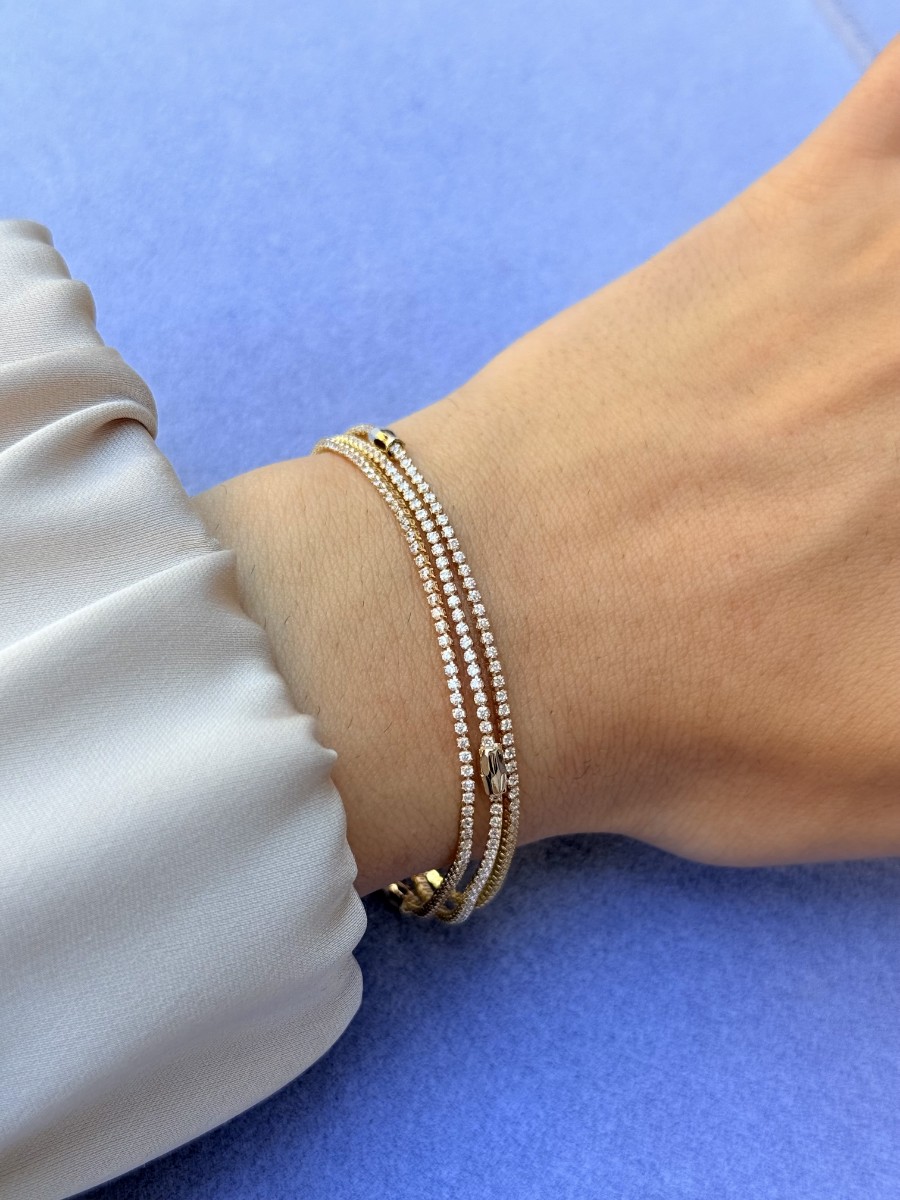 İnce taş dizili ve küçük yuvarlak detaylarla hareket kazandırılmış gümüş bilezik. Günlük kullanım için zarif bir seçenek.