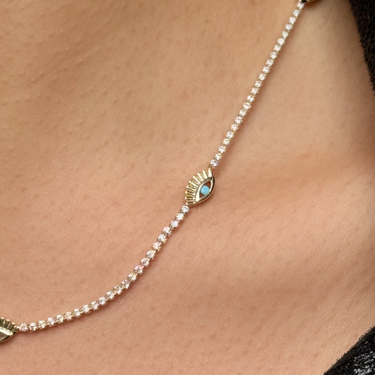 Göz formundaki mavi taşlar ve altın detaylar, koruyucu bir anlam taşır. Klasik nazar temasının modern yorumu.