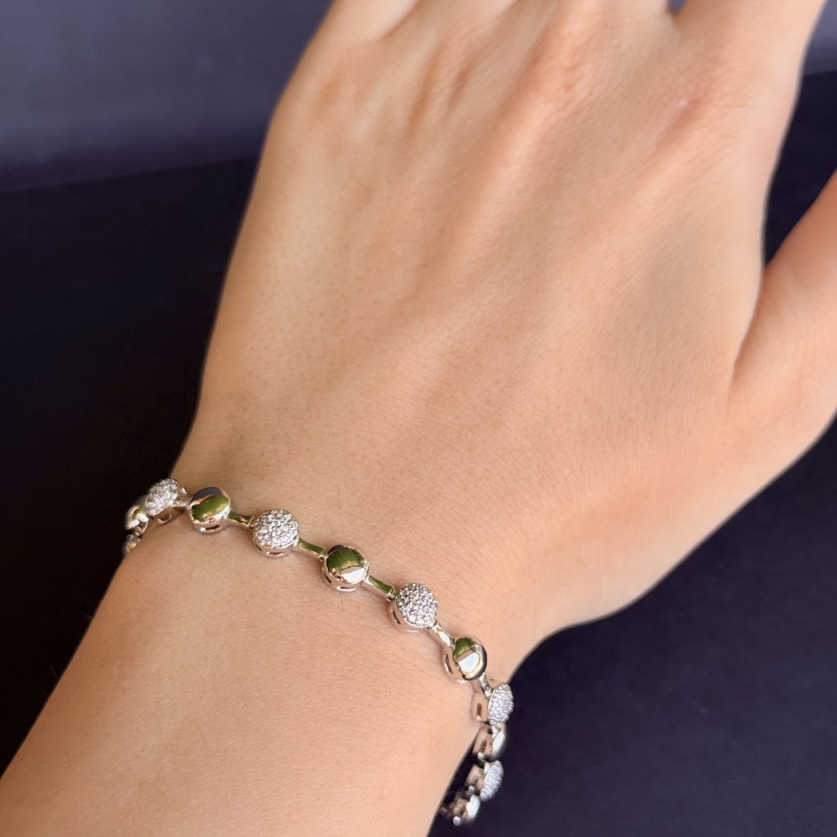 Sade ve zarif görünümüyle dikkat çeken bu gümüş bilezik, yuvarlak formdaki taş detaylarıyla ışığı mükemmel şekilde yansıtır. Günlük kullanım için ideal olduğu kadar özel günlerde de şıklığınızı tamamlar. Minimal tasarımıyla hem tek başına hem de diğer aksesuarlarla kombinlenebilir.