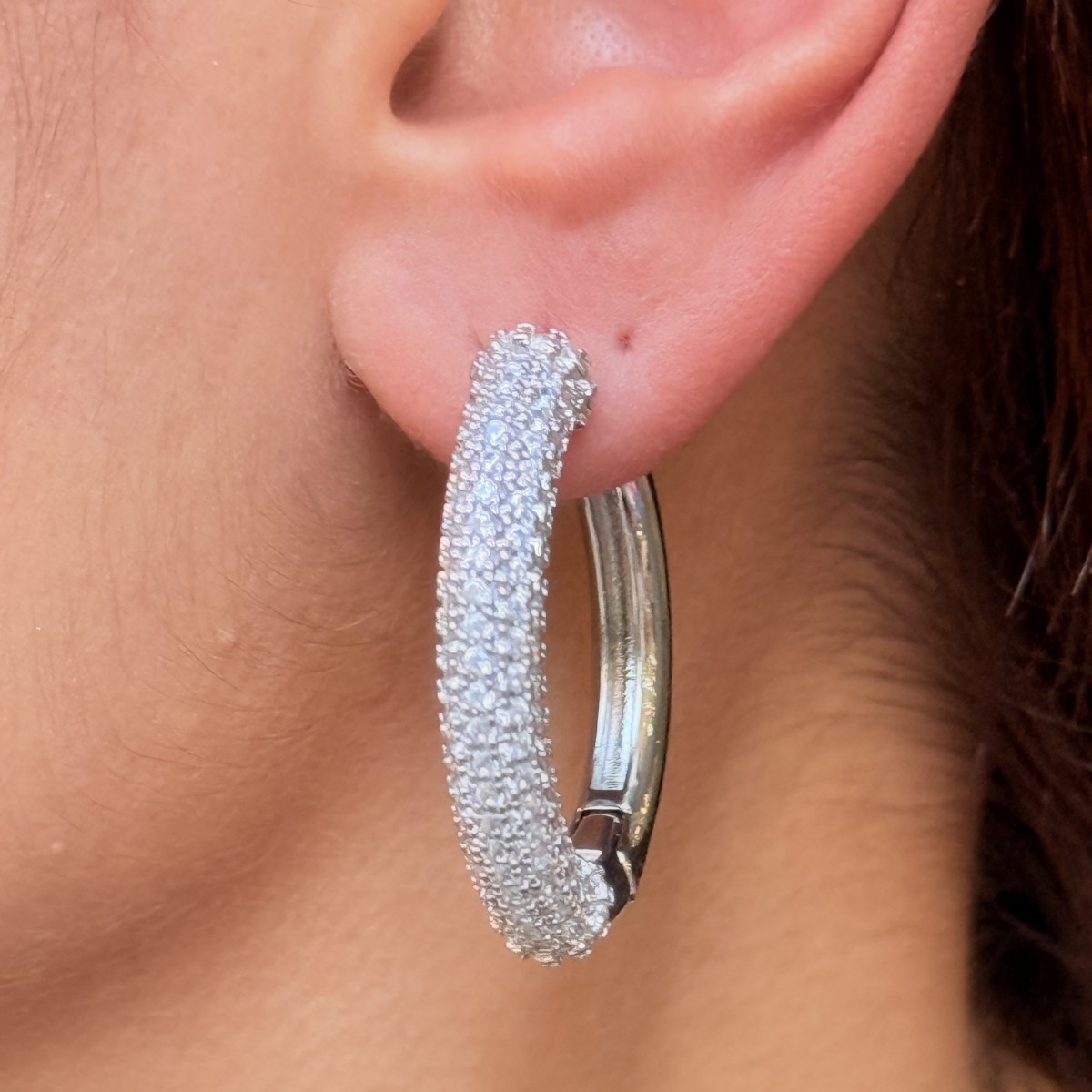 Büyük halka formu, tamamen taşlarla işlenmiş yüzeyiyle birleşerek göz kamaştırıcı bir bütün oluşturuyor. Her hareketle ışığı yakalayan bu küpe, iddialı bir stilin olmazsa olmazı.