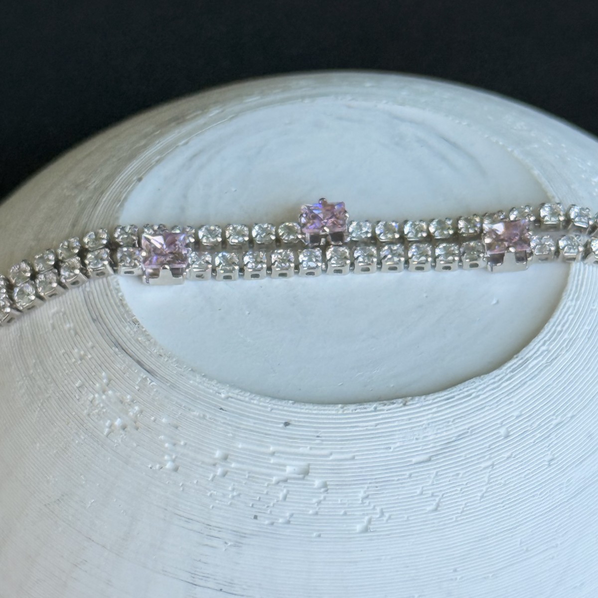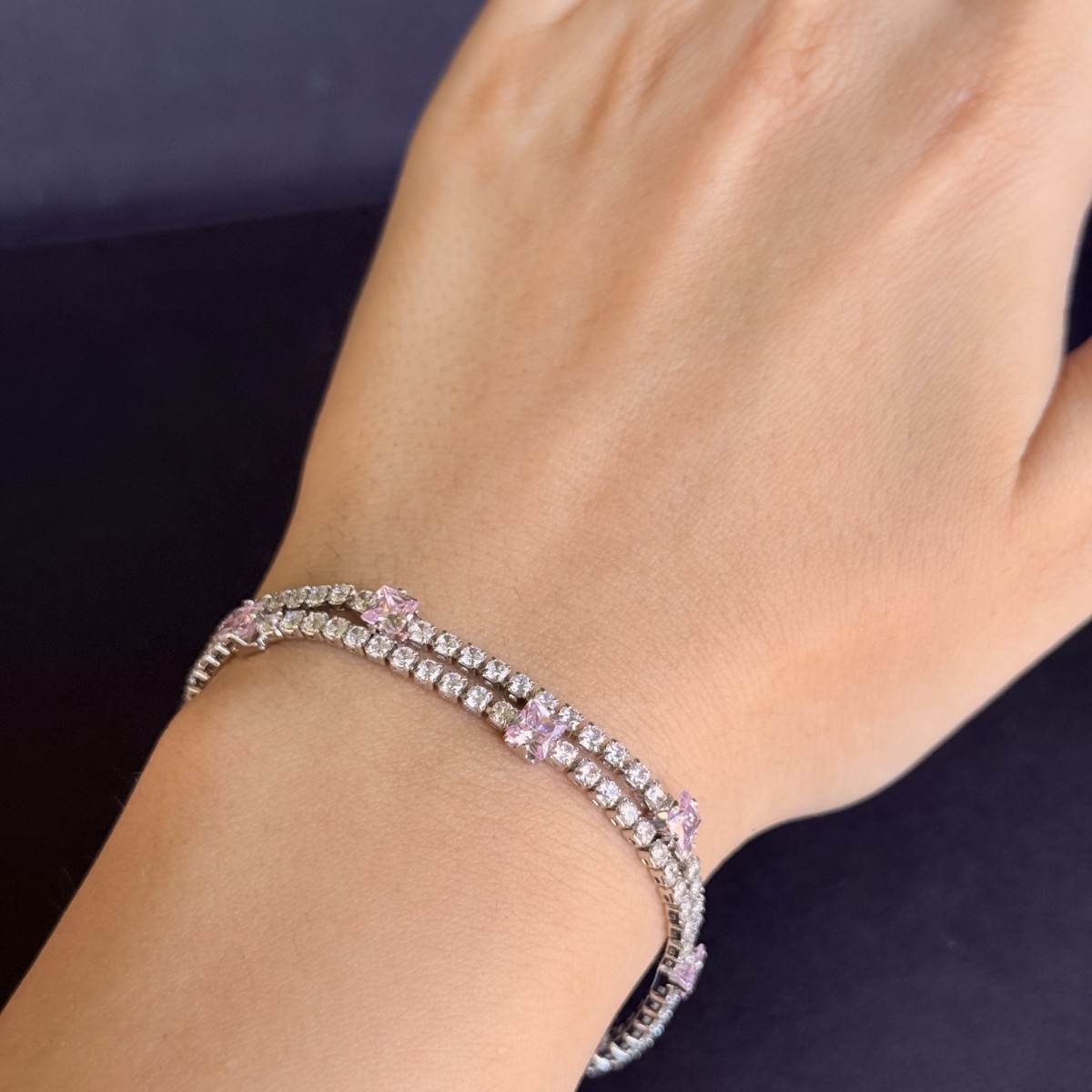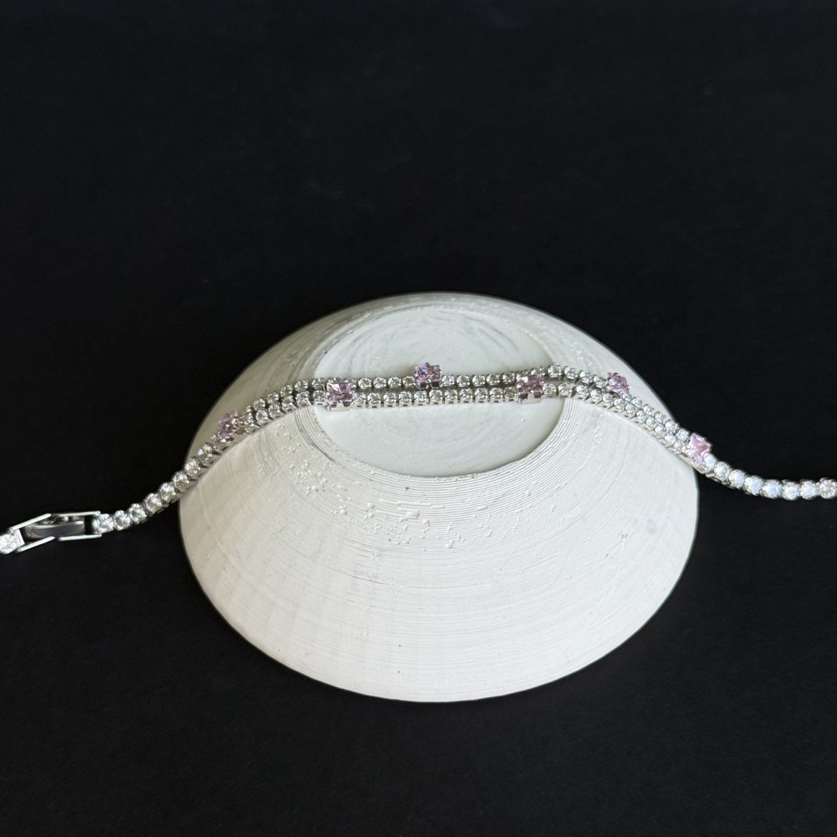 İkili ayrılarak ortada şık bir boşluk oluşturan ve kenarlarda birleşen formu, tasarıma modern bir dokunuş katıyor. Üzerindeki pembe taşlarla zarafeti romantizmle buluşturur.