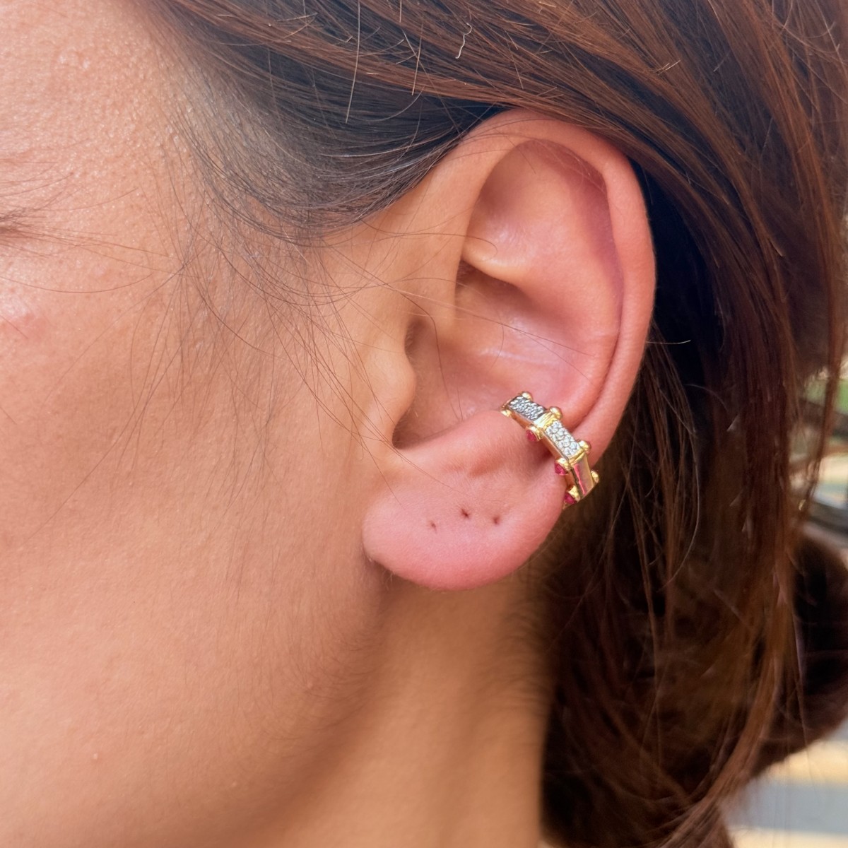 Altın ve taş detaylı küçük halka, kulakta zarif ama renkli bir etki bırakıyor.