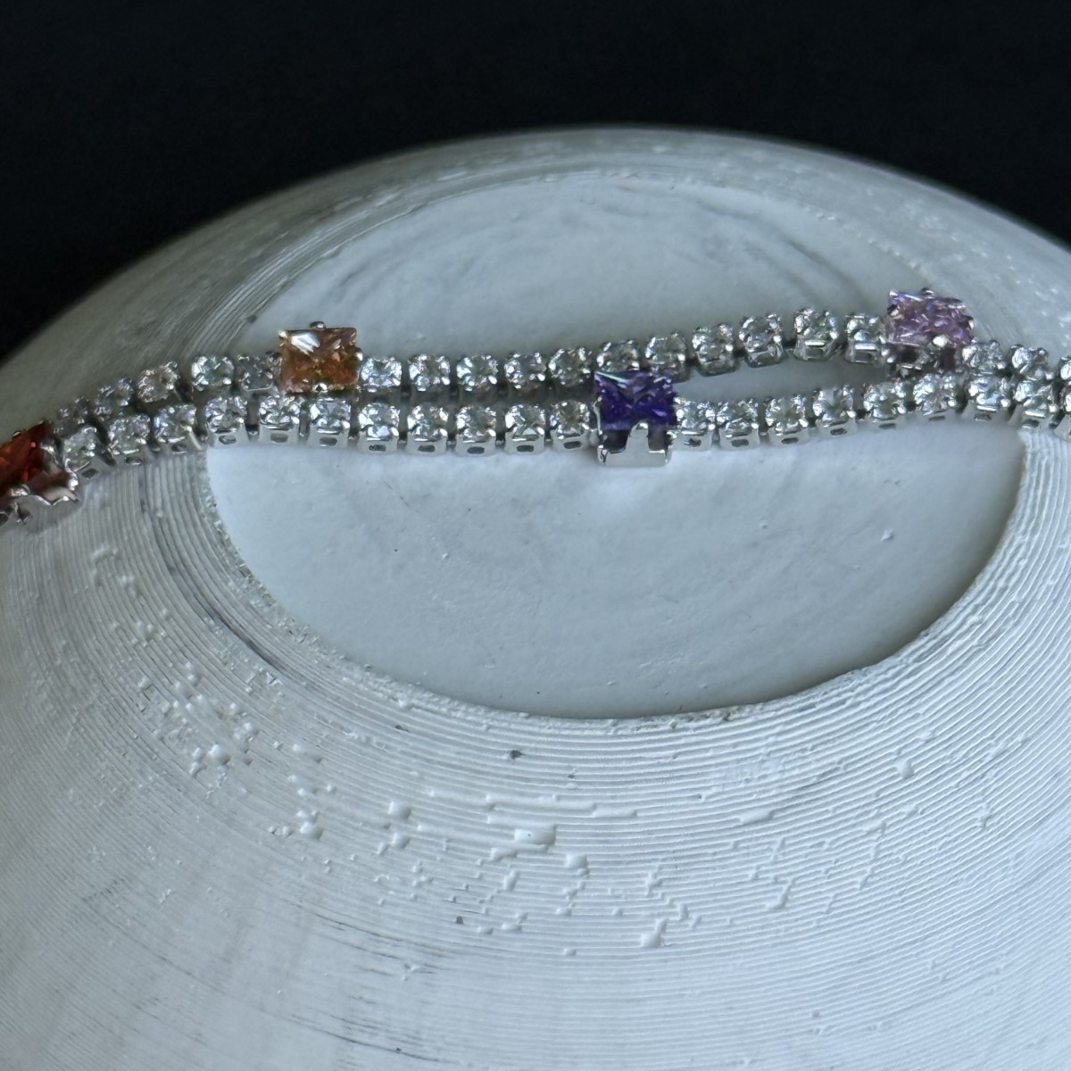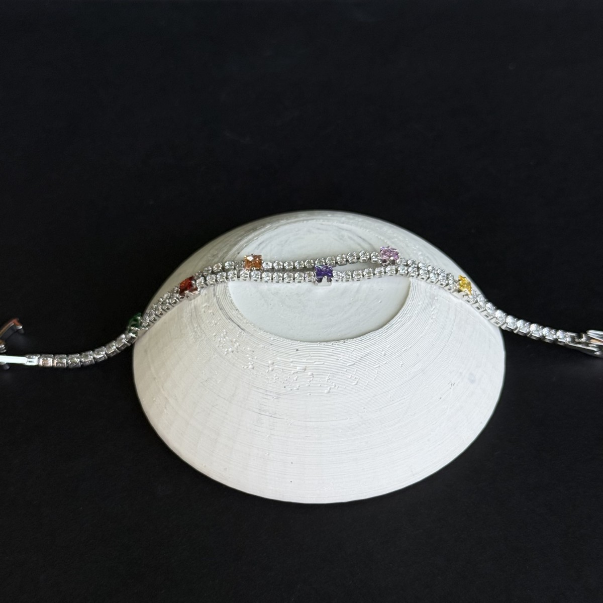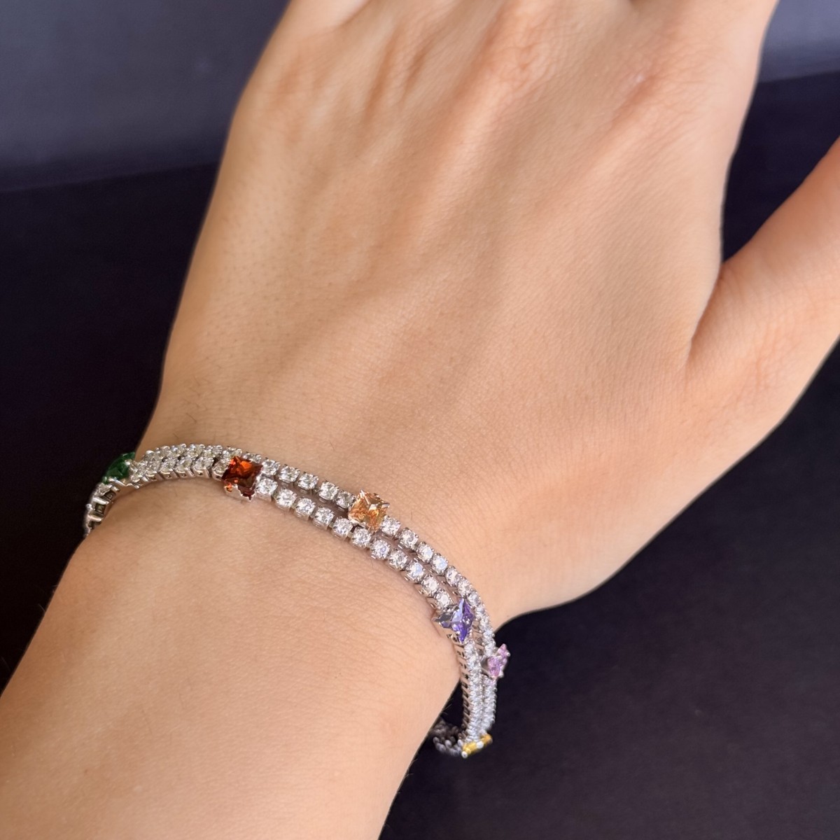 Ortadan ayrılan ikili form ve kenarlarda birleşen yapısıyla farklı bir duruş sergileyen bu bileklik, renkli taş detaylarıyla enerjik bir stil yaratıyor. Canlı ve eğlenceli görünüm isteyenler için.