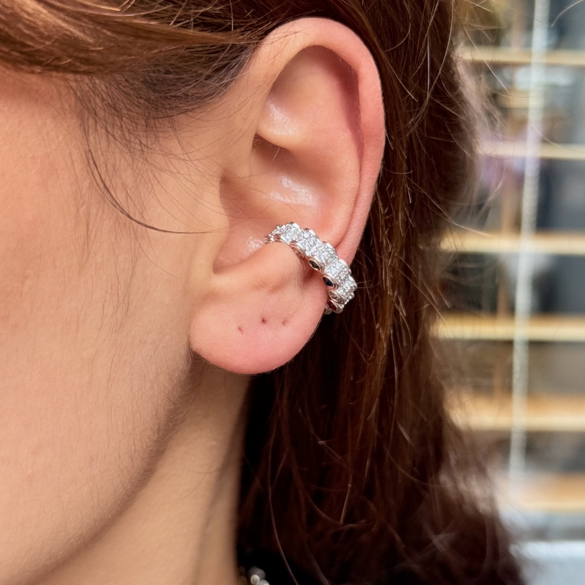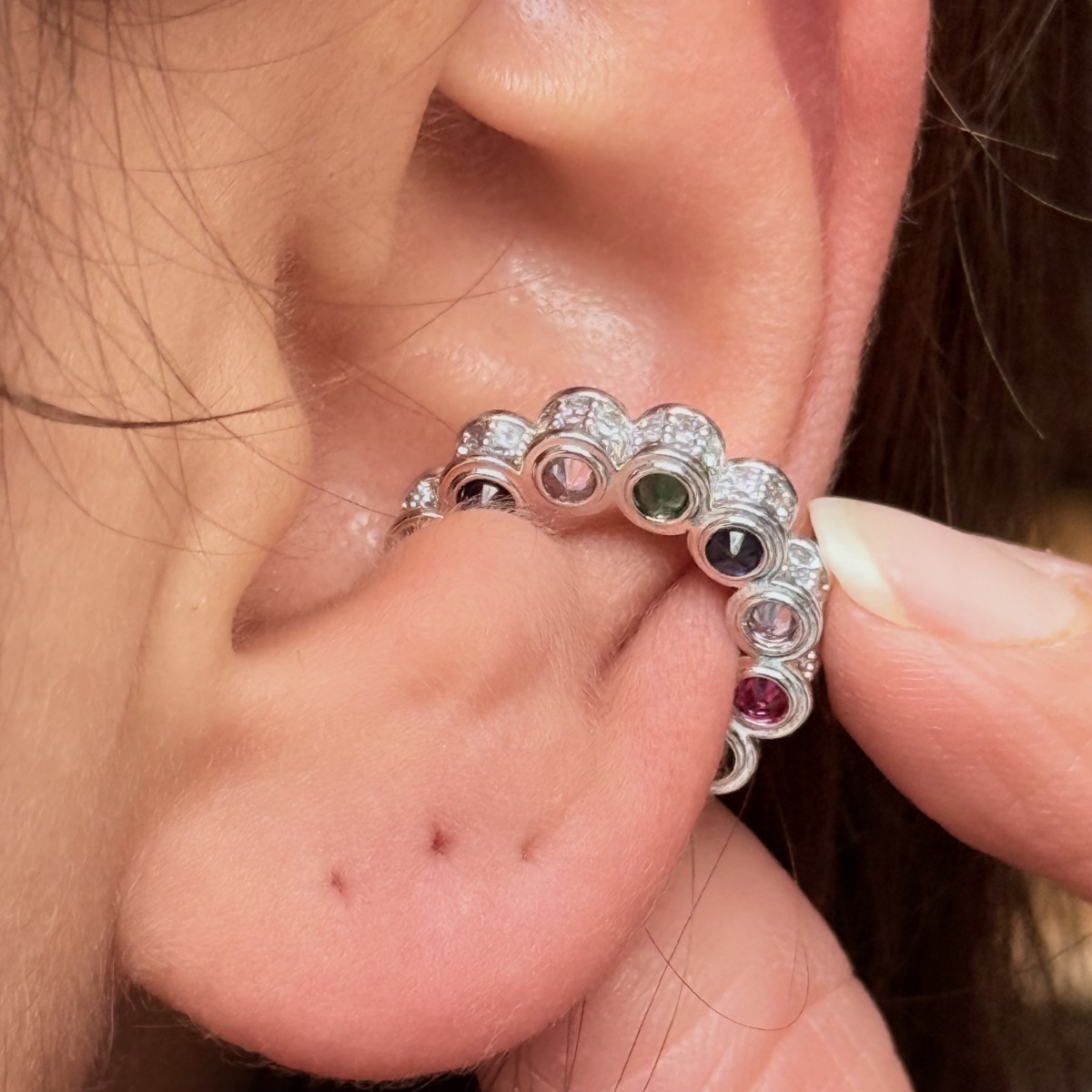Her biri farklı renkte taşlarla işlenmiş, kulağın kıvrımında zarif bir vurgu yaratan modern tasarım.