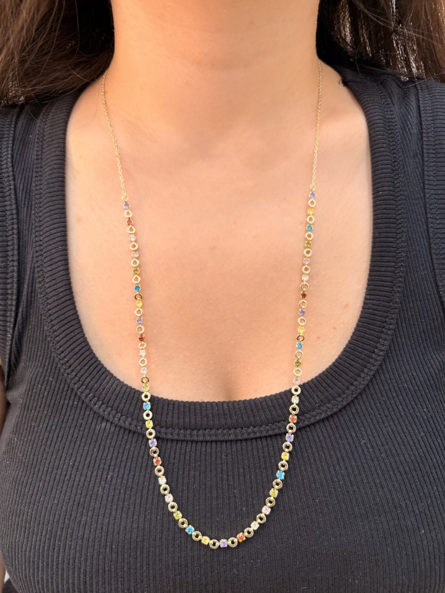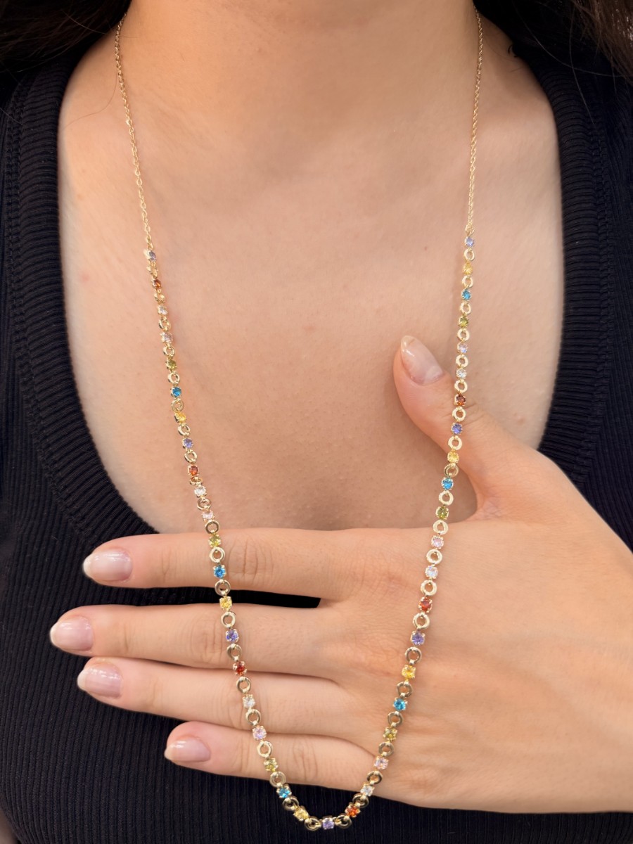 Zarif yuvarlak detaylarla işlenen gökkuşağı renkli taşlardan oluşan şık kolye. Günlük kombinlere renkli bir dokunuş katar.