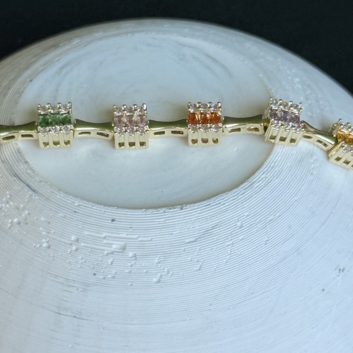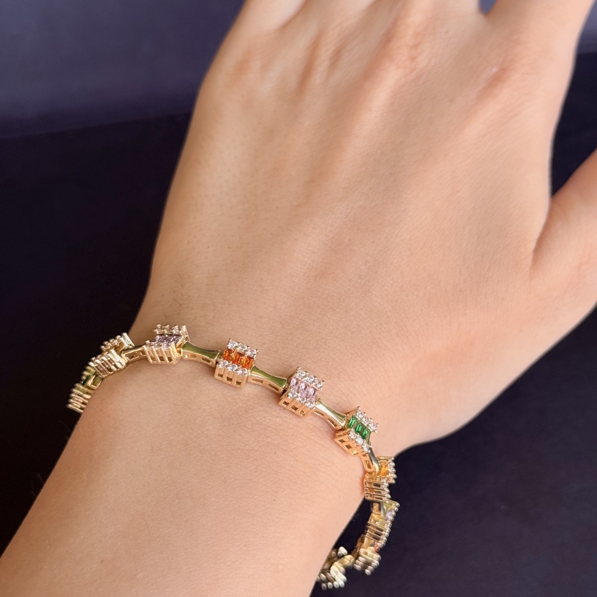 Yeşil, pembe, turuncu ve mor tonlarında yerleştirilmiş taşların sıralanmasıyla renkli bir ışıltı kazandırılmıştır. Minimal ama canlı tasarımıyla özellikle yaz ve bahar kombinlerine enerji katacak şık bir modeldir.