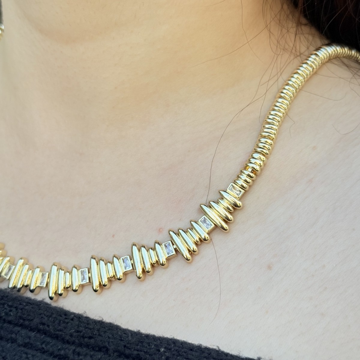 Spiral gövdeli, aralıklı baget taş detaylı statement kolye.