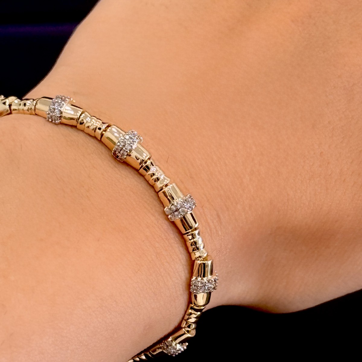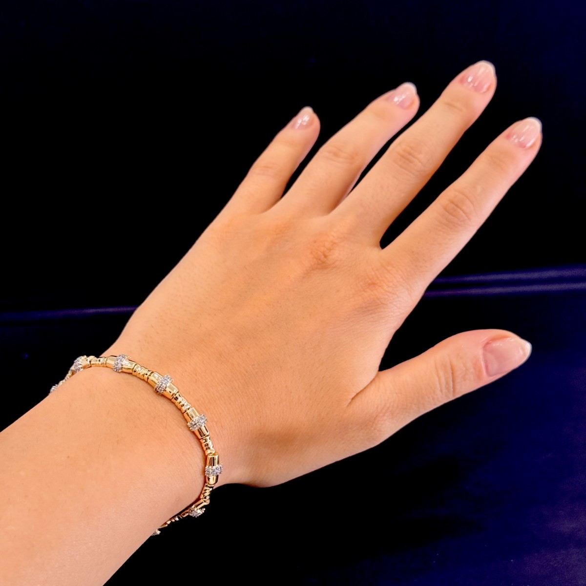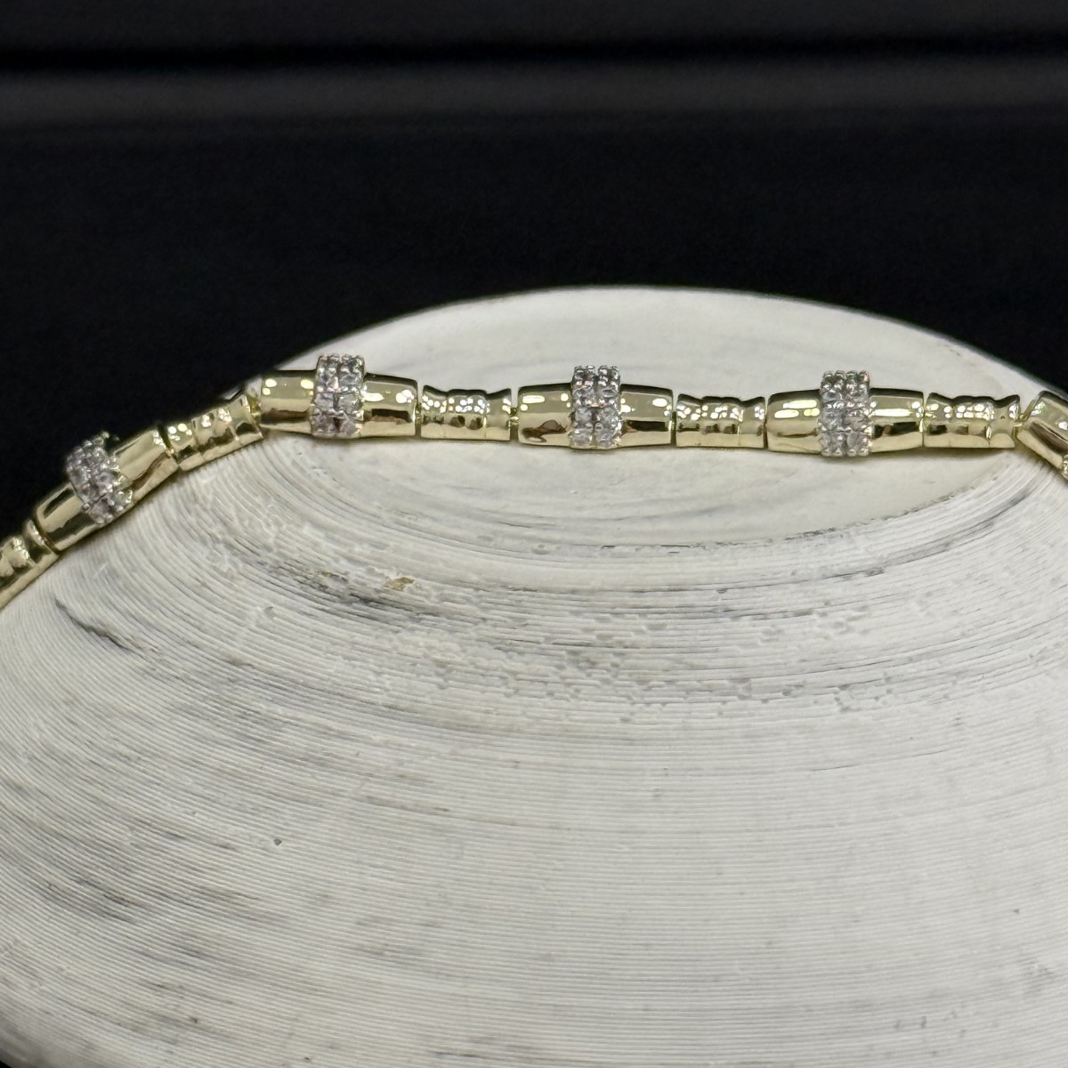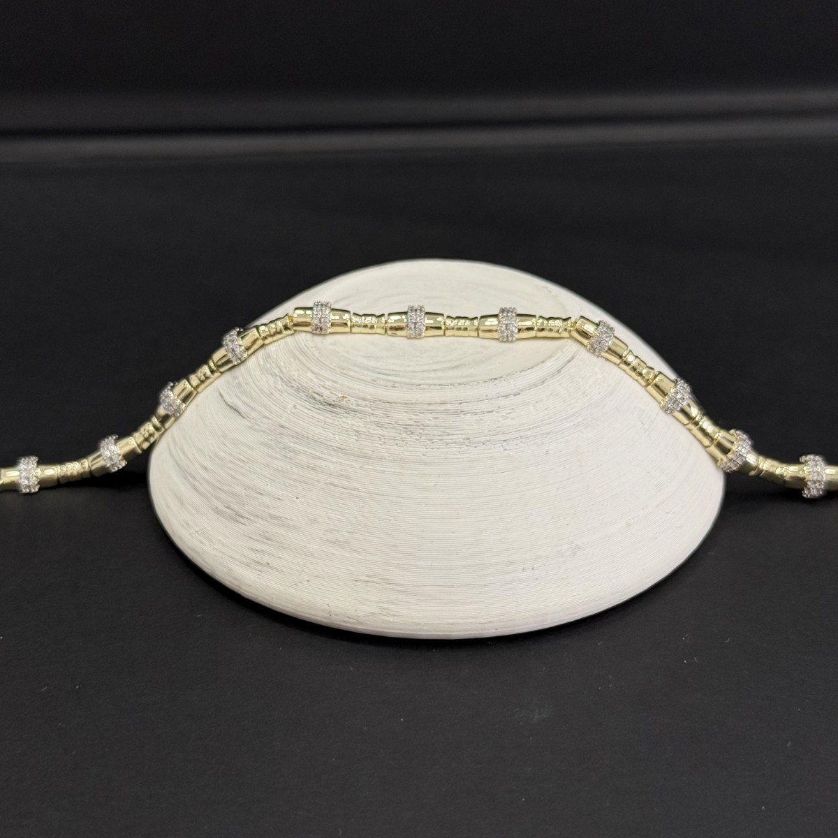 Parlak, silindir formda modüller ve her modülün arasında mikro pavé zirkon istasyonlar… Düzenli aralıklarla tekrarlayan bu dizilim, bileğe hareketli ama derli toplu bir parlaklık verir.
