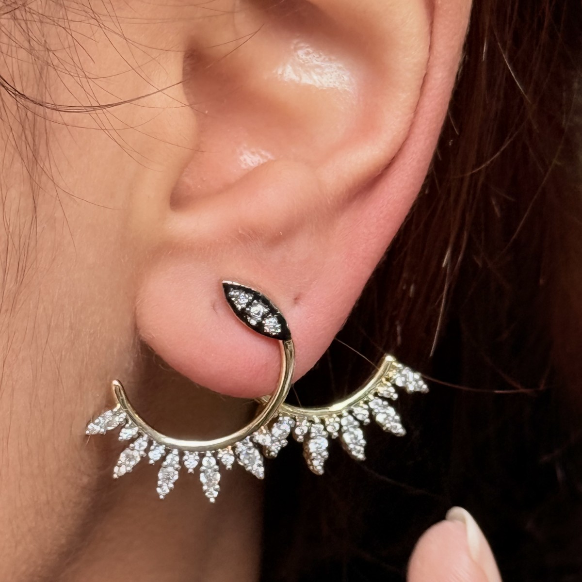 Siyah taşın keskin kontrastı, yarım halo formuyla birleşerek modern bir ışıltı yaratıyor.